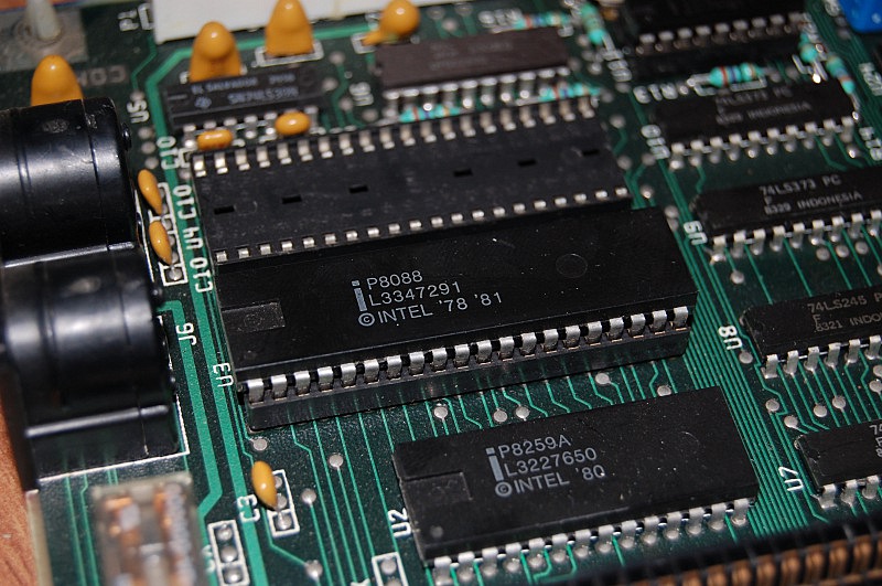 This is the CPU - P8088 - an Intel 8088 running at 4.77 MHz. IBM shipped the 5150 with CPUs from AMD and other approved Intel 8088 manufacturers in order to secure a consistent supply.