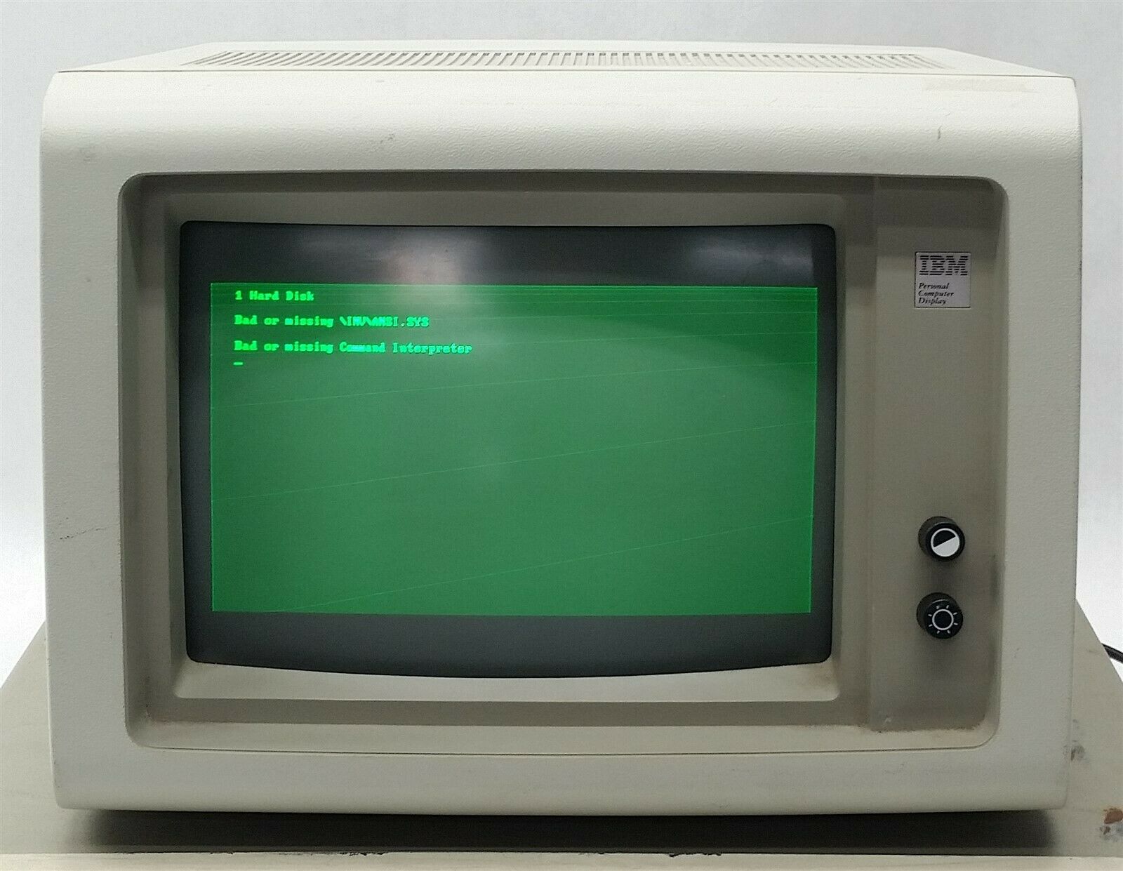 The IBM 5153 13" Color Monitor, designed to be paired with the Color Graphics Adapter (CGA). In 1981, this would have set you back $680 for the monitor alone. The brightness and contrast knobs are the same as on the 5151, but the 5153 got a front power knob too!