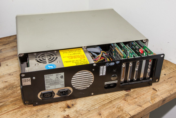 The top of the case slides forward after removing 5 screws (2 on early 5150s). This one is a later 5150 that has the 16K-256K motherboard because it has the "B" stamp at the top, and the power supply is silver (in early 5150s these were black).