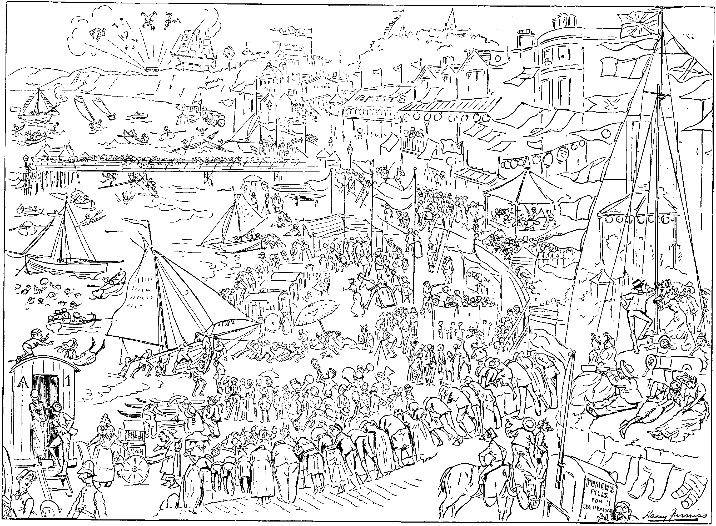 I passed two unhappy-looking stone eagles protecting a boarding-house, and a shed given over to the sale of lollipops and the hiring of a pony-chaise. The cottages seemed to me to be of the boat-turned-bottom-upwards order of architecture, and were adorned with placards, announcing "Apartments to Let." Everything seemed to let, except, perhaps, the church, which, however (on second thoughts), appeared to be let alone. But if the houses were not, in themselves, particularly inviting, their names were pleasing enough, although, truth to tell, a trifle misleading. For instance, there was a "Marine Lodge," which seemed a very considerable distance from the ocean, and a "Swiss chalet," that but faintly suggested the land renowned equally for mountains and merry juveniles. I did not notice any shops, although I fancy, from the appearance of a small barber's pole that I found in front of a cottage, that the hair-dressing interest must have had a local representative. For the rest, an air of hopefulness, if not precisely cheerfulness, was given to the place by the presence of a Convalescent Hospital. Leaving the village behind me, I came, footsore and staggering, at length to the Bay. I was cruelly disappointed. Below me was what appeared to be a small portion of Rosherville, augmented with two bathing-machines, and a residence for the Coast-guard. There was a hotel, (with a lawn-tennis ground), and several placards, telling of land to let. The descent to the sea was very steep, and, on the high road above it, painfully modern villas were putting in a disfiguring appearance. On the beach was a melancholy pic-nic party, engaged in a mild carouse. In the gloaming was a light-ship, marking the end of the Goodwin Sands.