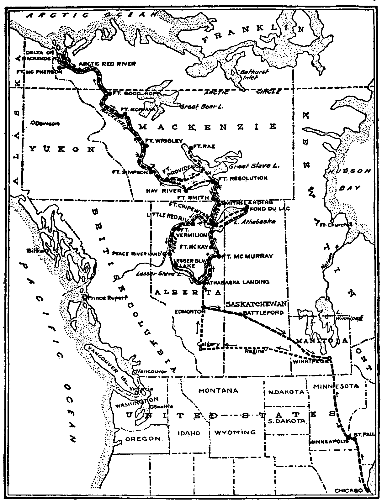 Kipling speaks of "a route unspoiled of Cook's," and we have found it. Going to the office of Thos. Cook & Son, in Chicago, with a friend who had planned a Mediterranean tour, I gently said, "I wonder if you can give me information about a trip I am anxious to take this summer." The young man smiled and his tone was that which we accord to an indulged child, "I guess we can. Cook & Son give information on most places." "Very well," I said, "I want to go from Chicago to the Arctic by the Mackenzie River, returning home by the Peace and the Lesser Slave. Can you tell me how long it will take, what it will cost, and how I make my connections?" He was game; he didn't move an eyebrow, but went off to the secret recesses in the back office to consult "the main guy," "the chief squeeze," "the head push," "the big noise." Back they came together with a frank laugh, "Well, Miss Cameron, I guess you've got us. Cook's have no schedule to the Arctic that way." They were able, however, to give accurate information as to how one should reach Hudson Bay, with modes of travel, dates, and approximate cost. But this journey for another day.