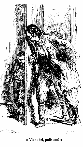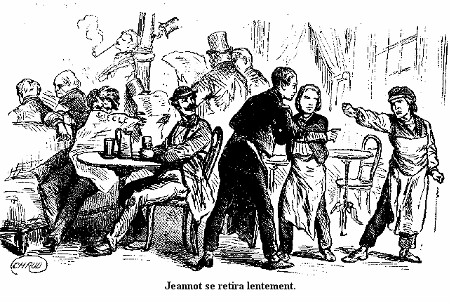 Voyons, Jeannot, sois raisonnable! Je pars comme toi; est-ce que je crie, est-ce que je pleure comme toi! Puisqu'il faut partir, à quoi ça sert de pleurer? Que fais-tu de bon ici? rien du tout. Et à Paris, nous allons retrouver Simon, et il nous aura du pain et du fricot. Et il nous trouvera de l'ouvrage pour que nous ne soyons pas des fainéants, des propres à rien. Et ici, qu'est-ce que nous faisons? Nous mangeons la moitié du pain de maman et de ma tante. Tu vois bien! Sois gentil: dis adieu à ma tante, et viens avec moi. Le voisin Grégoire a donné à maman une bonne galette et un pot de cidre pour nous faire un bon souper, et puis Daniel nous a donné un lapin qu'il venait de tuer.»