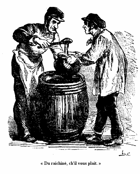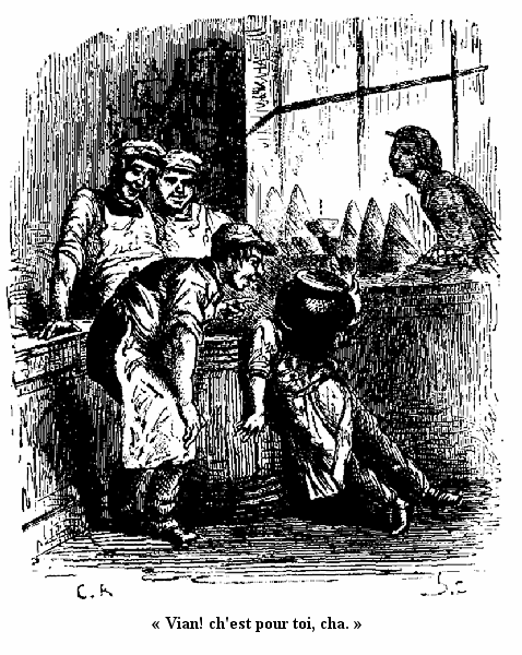 Pendant un quart d'heure on n'entendit d'autre bruit dans la salle du festin que celui des mâchoires qui broyaient leur nourriture, des couteaux qui glissaient sur les débris d'assiette, du cidre qui passait du broc dans le verre unique servant à tour de rôle à la mère et aux enfants.