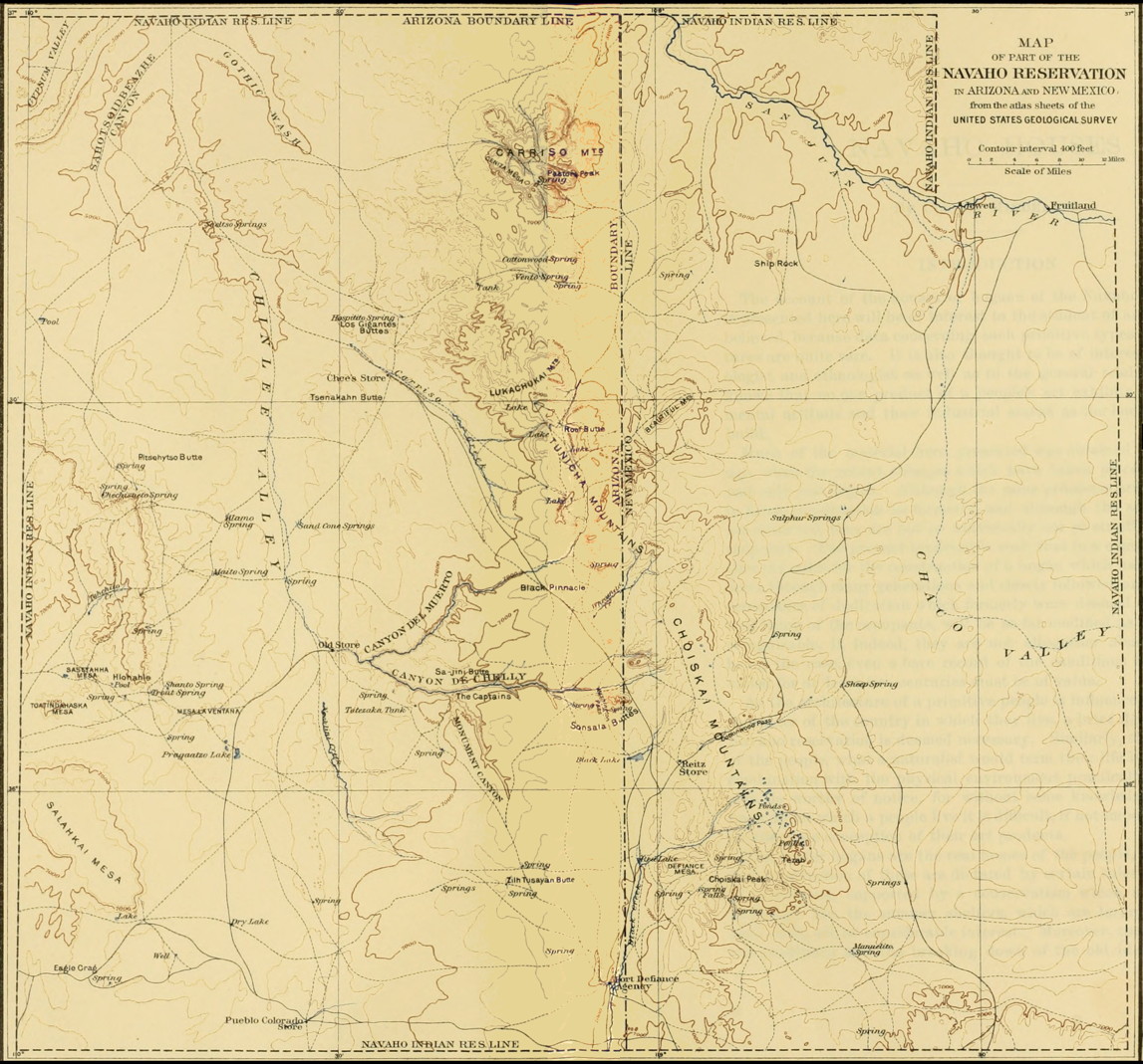 On the west the mountains break down into Chinlee valley by a gradual slope—near the summit quite steep, then running out into table-lands and long foothills. This region is perhaps the most desirable on the reservation, and is thickly inhabited. On the east the mountains descend by almost a single slope to the edge of the approximately flat Chaco valley. In a few rods the traveler passes from the comparatively fertile mountain region into the flat, extremely arid valley country, and in 50 or 60 miles’ travel after leaving the mountains he will not find wood enough to make his camp fire, nor, unless he moves rapidly, water enough to carry his horses over the intervening distance.