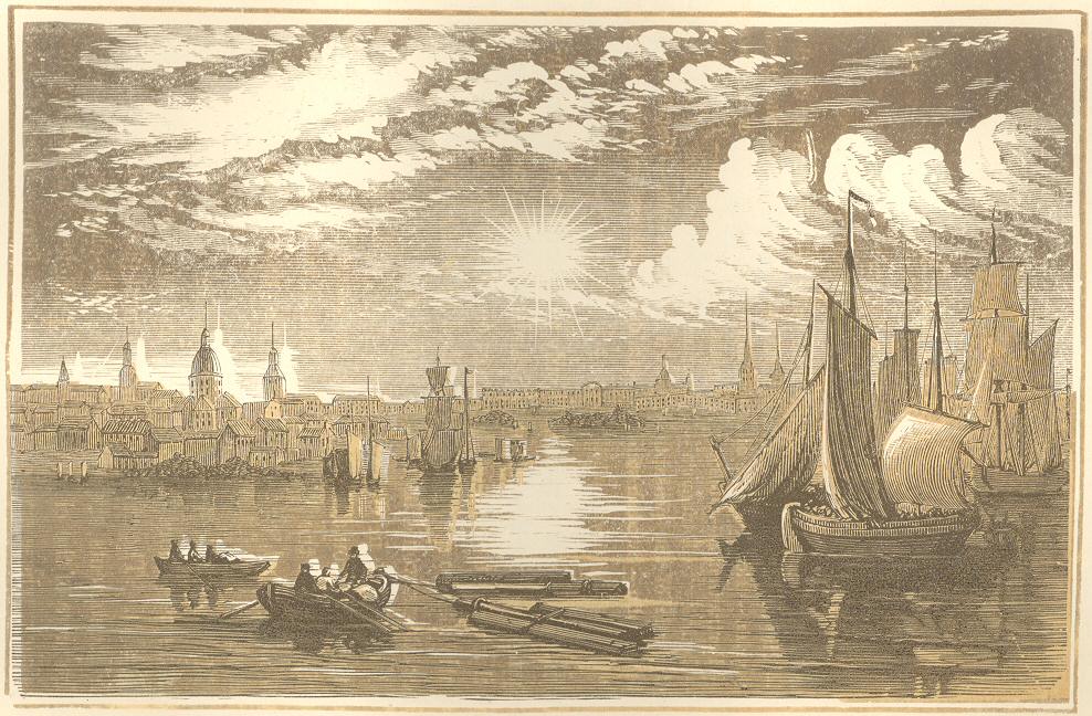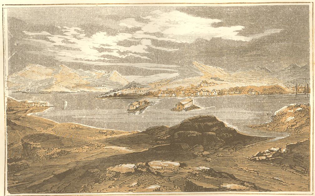 The left bank of the river is here so crowded with masses and walls of rock, that there is only room at intervals for an isolated farm or hut.  Suddenly the tops of masts appear between the high rocks, a phenomenon which is soon explained; a large gap in one of the rocky walls forms a beautiful basin.