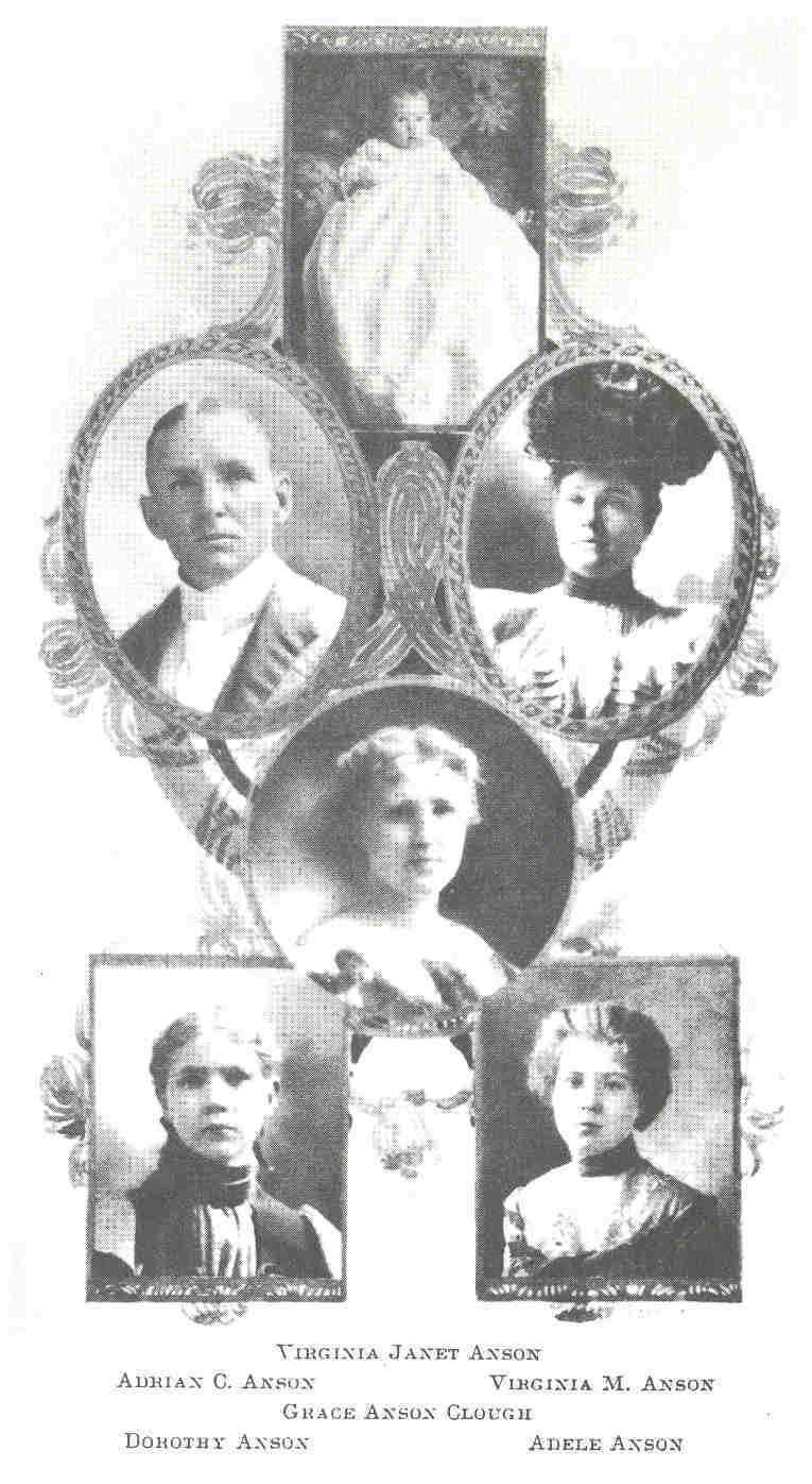 He and his father, Warren Anson, his grandfather, Jonathan Anson, and his great-grandfather, Silas Anson, were all born in Dutchess County, New York, and were direct descendants of one of two brothers, who came to this country from England some time in the seventeenth century. They traced their lineage back to William Anson, Esq., of Lincoln's Inn, an eminent barrister in the reign of James I, who purchased the Mansion of Shuzsborough, in the county of Stafford, and, even farther back, to Lord Anson, a high Admiral of the English navy, who was one of the first of that daring band of sailors who circumnavigated the globe and helped to lay the foundation of England's present greatness.