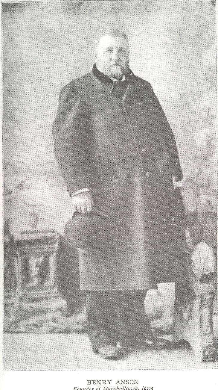 The first log cabin that was erected in Marshalltown was built by my father, Henry Anson, who is still living, a hale and hearty old man, whose only trouble seems to be, according to his own story, that he is getting too fleshy, and that he finds it more difficult to get about than he used to.