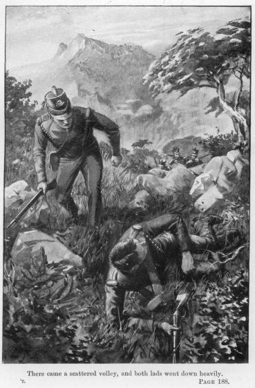 But, as it happened, that next shot was accompanied by many more; and as, fearing to move, he strained his eyes upward, he could see the grey smoke rising, and hear the sound of a bugle, followed by the rush of feet, and he knew that, so far, he had not been seen, but that the strong body of the enemy were hurrying along the mule-track in full pursuit of his friends.