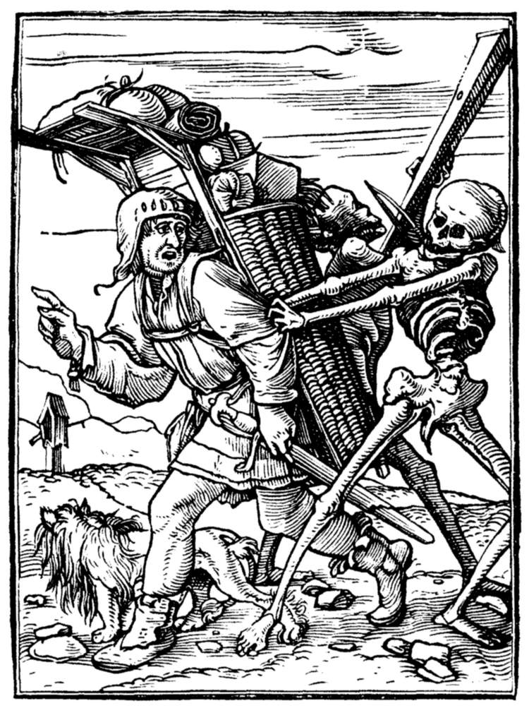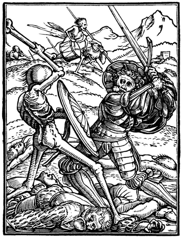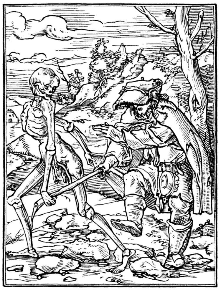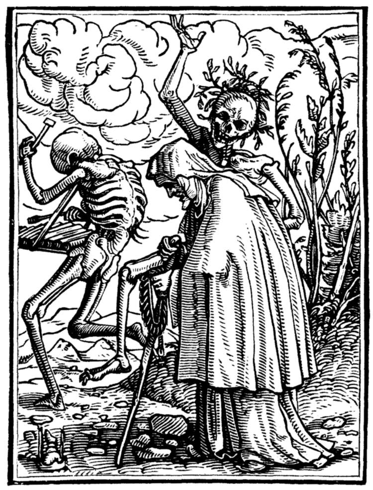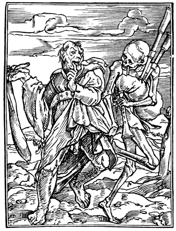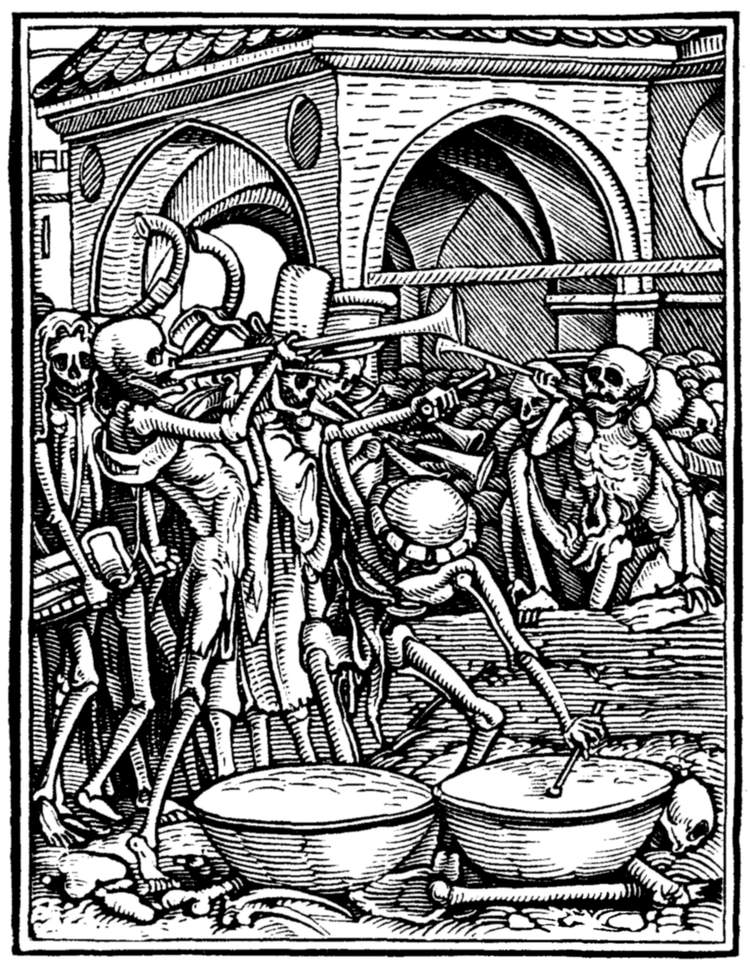 A crowd of skeletons, playing on horns, trumpets, and the like, summon mankind to the grave. | |