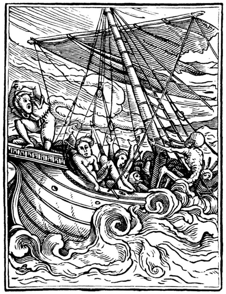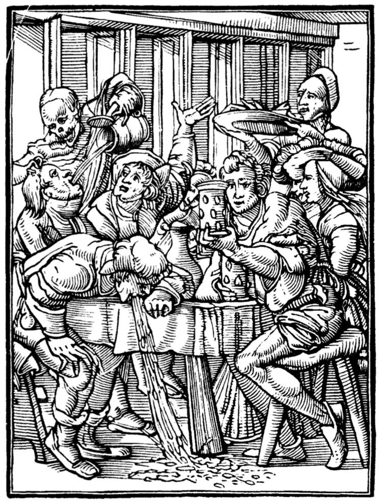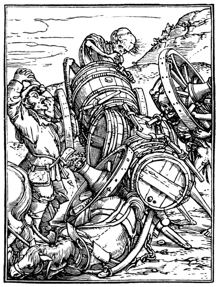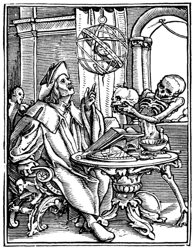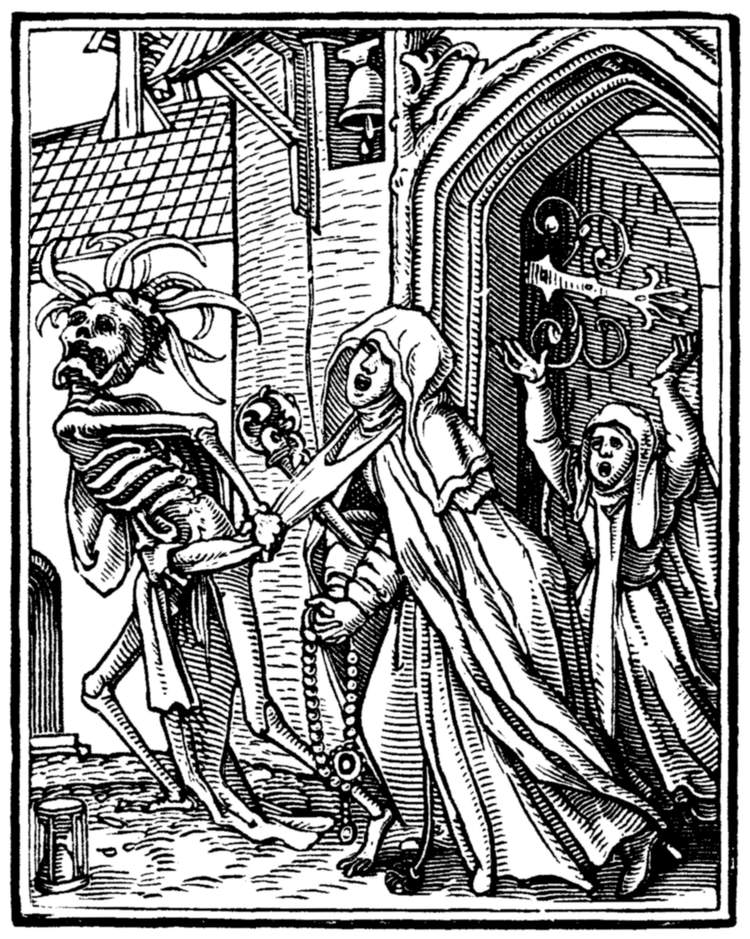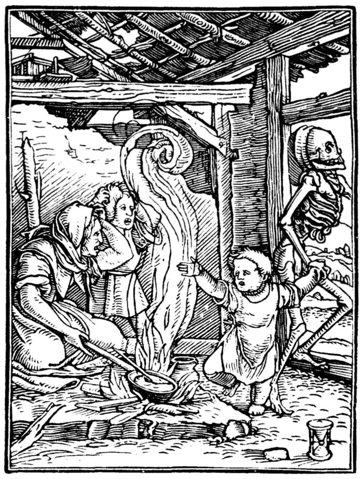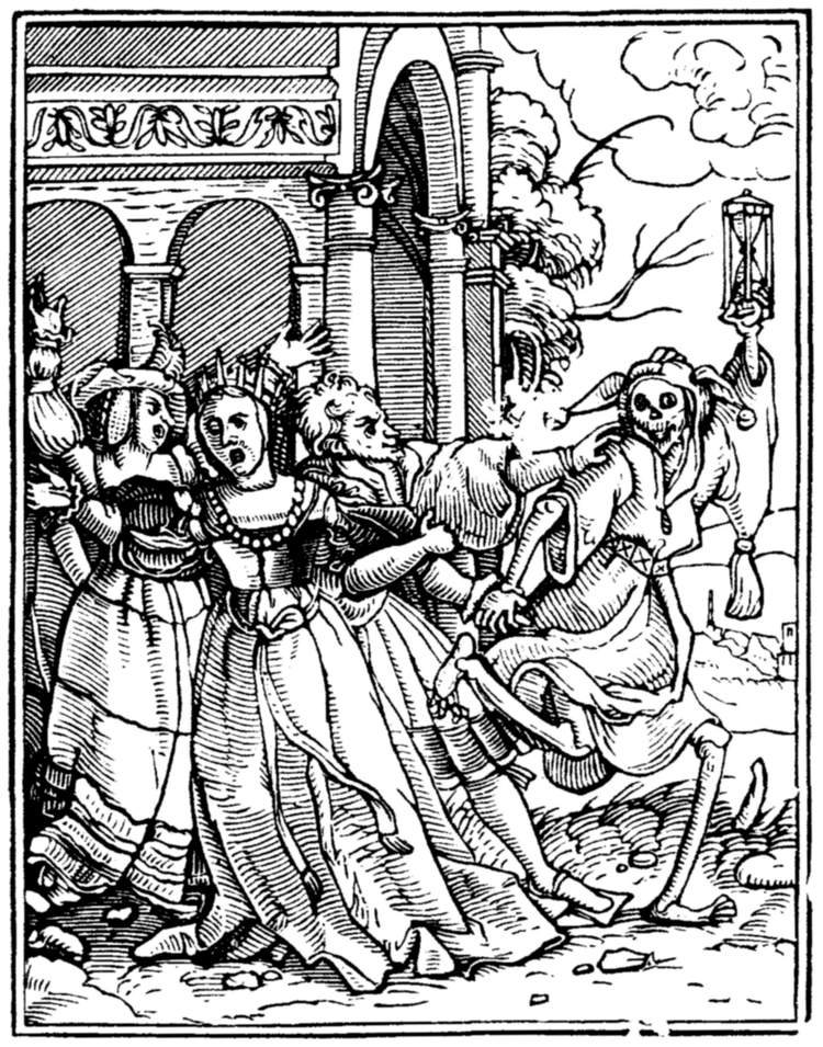 A crowd of skeletons, playing on horns, trumpets, and the like, summon mankind to the grave. | |