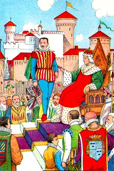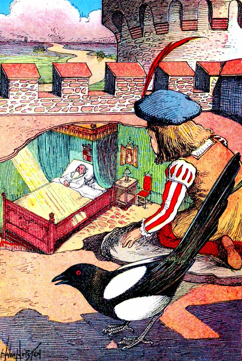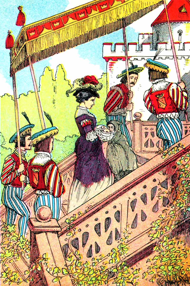 [6]By six in the morning all the royal household had dressed itself in its very best; and then the little Prince was dressed in his magnificent christening robe; which he did not like at all, but kicked and screamed like any common baby. When he had calmed down, they carried him to the bed where the Queen lay.
