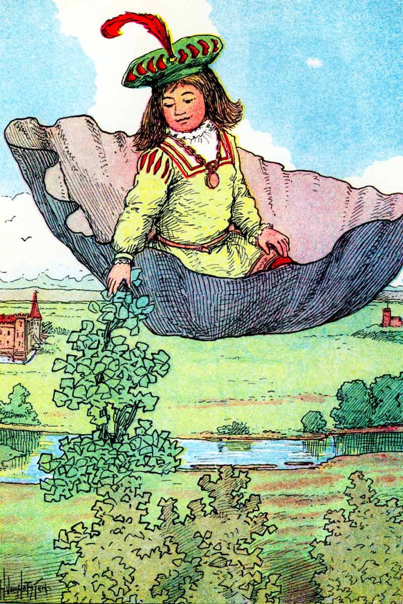 Such a procession! Heralds in blue and silver; pages in crimson and gold; and a troop of little girls in dazzling white, carrying baskets of flowers, which they strewed all the way before the child and the nurse,—finally the four and twenty godfathers and godmothers, splendid to look at.
