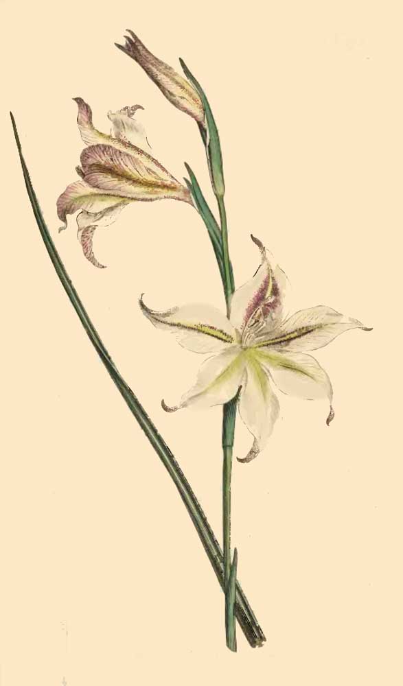 GLADIOLUS longiflorus caule tereti, tubo longissimo, spathis foliisque linearibus glabris. Linn. Suppl. p. 96. Gmel. Syst. Vegetab. ed. 14. Murr. p. 86.