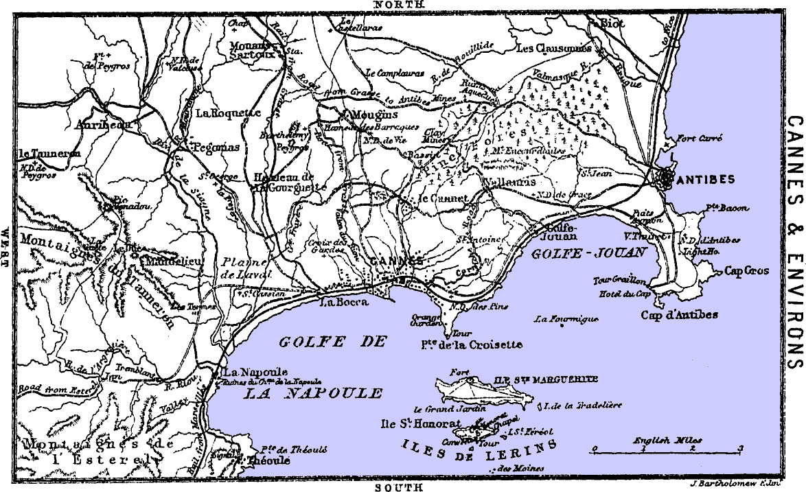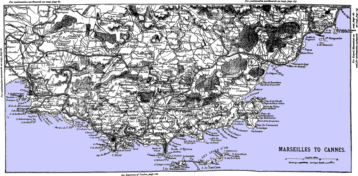 This map shows principally the position of the towns in the interior, approached by diligence from Grasse (near Cannes), Draguignan, and Nice. From Nice start the diligences which run between France and Italy.