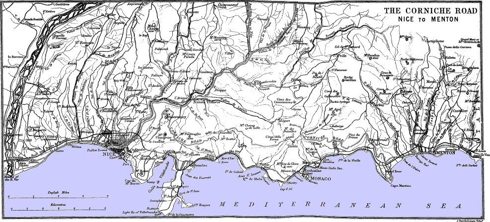 Showing the course of the upper Corniche Road from Nice to Menton, as well as that of the lower and perhaps more beautiful road between Nice and Monte-Carlo, extending along the coast, nearly parallel to the railway.