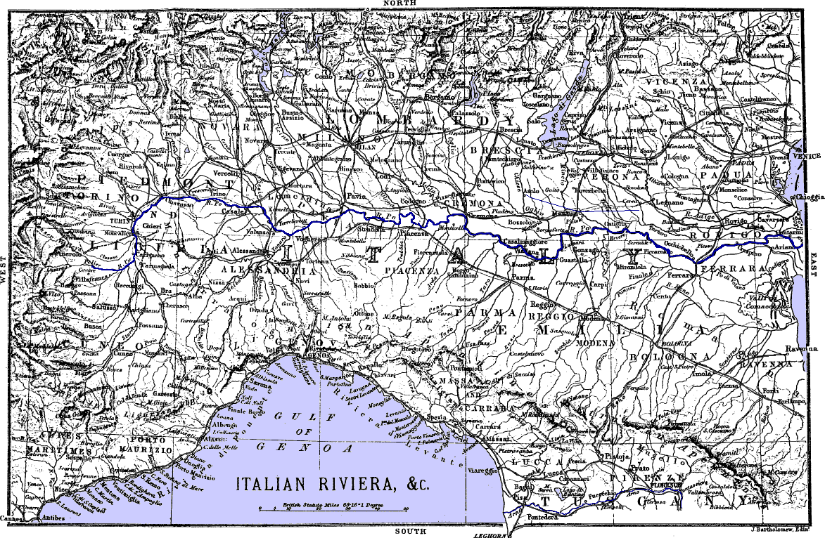 47¼ m. N. from Genoa and 56¼ m. S.E. from Turin is Alessandria, pop. 30,000, 234¼ m. N.W. from Florence by Piacenza, Parma, Modena, Bologna, and Pistoja. See Black’s South France, East half. See map, page 199.