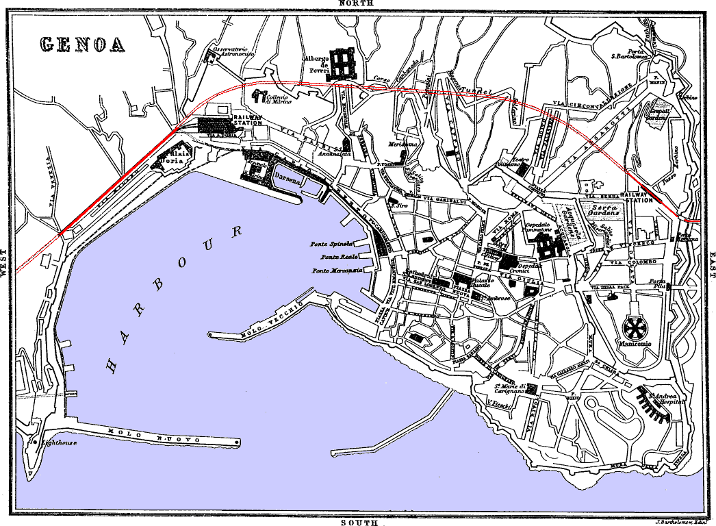 Genoa.—The train after traversing the first tunnel emerges at the busy populous suburb of Sampierdarena, 1¼ m. W. from Genoa and 2½ m. E. from Sestri-Ponente. The rail now turns northward and ascends the valley of the impetuous torrent of the Polcevera, traversing six tunnels. Having passed Rivarolo, Bolzaneto, and Pontedecimo, the train arrives at Busalla, 14¼ m. N. from Genoa and 89¼ m. S. from Turin. Busalla is situated on the culminating part of the line (1192 ft.), on the crest which divides the basin of the Adriatic from the Gulf of Genoa. Here also the gradients of the line are highest, being about 1 in 28½ or 35 in 1000. The longest tunnel on the line, the Galleria dei Giovi, 3390 yards, is just before arriving at Busalla. It perforates calcareous schists, and is ventilated by 14 shafts. The scenery, which has been hitherto very picturesque, becomes tame after traversing the last tunnel at Arquata, 26 m. N. from Genoa, in the narrow valley of the Scrivia. 33½ m. N. from Genoa, and 70 m. S. from Turin, is Novi, H. La Sirena, a town of 11,000 inhabitants, situated among hills; where, in August 15, 1799, a great battle took 280 place between the French under Joubert and the Austrians and Russians under Suwarrow, when the former were defeated and their general killed. Novi is 60 m. S.W. from Milan by Tortana, Voghera, and Pavia.