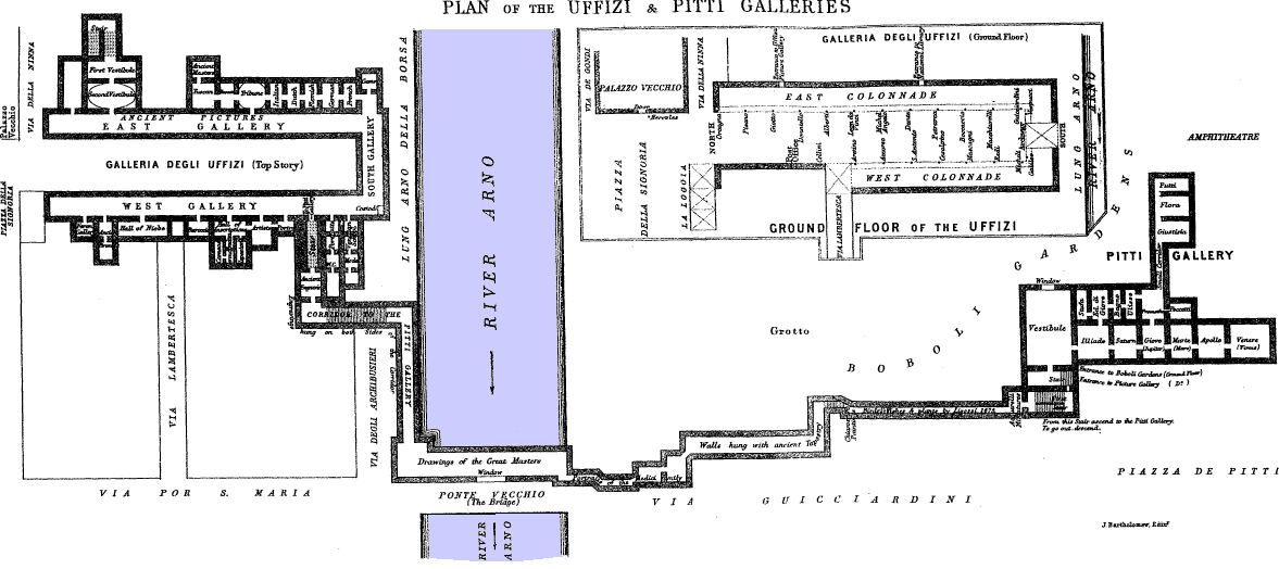 The Florence Picture Gallery. Contained in two vast edifices on both sides of the Arno; united by long corridors, which from the Uffizi straggle down to the river, cross the bridge, and reach the Pitti Palace by the upper story of the houses bordering the Via Guicciardini.
