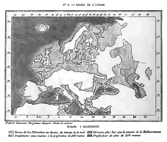 13 Si par la pensée au lieu d'imaginer un exhaussement de 200 mètres, on se figure le continent s'abaissant en bloc de la même quantité, l'Europe se trouverait n'occuper que la moitié son étendue actuelle; toutes les plaines basses, qui, pour la plupart, sont d'anciens fonds de mer, seraient immergées de nouveau dans l'Océan; il ne resterait plus au-dessus des eaux qu'une sorte de squelette de plateaux et de montagnes, beaucoup plus tailladé de golfes et frangé de presqu'îles que ne l'est le rivage existant. Toute l'Europe occidentale et méditerranéenne constituerait un puissant massif insulaire entouré de terres plus qu'à moitié submergées, telles que la Sicile et la Grande-Bretagne, et séparé par un large détroit des plaines légérement bombées de l'intérieur de la Russie. Ce massif, pour l'histoire non moins que pour la géologie, est la véritable Europe. A demi asiatique par son climat extrême, par l'aspect de ses campagnes monotones et de ses interminables steppes, la Russie se rattache aussi très-intimement à l'Asie par ses races et par son développement historique; on peut même dire qu'elle fait partie de l'Europe depuis un siècle à peine. C'est au milieu des îles, des péninsules, des vallées, des petits bassins, des horizons variés de l'Europe maritime et montagneuse; c'est dans cette nature si vive, si accidentée, aux contrastes si imprévus, qu'est née la civilisation moderne, résultat d'innombrables civilisations locales, heureusement unies en un seul courant. De même que les eaux, en s'épanchant des montagnes, ont fertilisé les plaines environnantes par le limon nourricier, de même les progrès de toute espèce, accomplis dans ce centre de rayonnement, se sont répandus de proche en proche à travers les continents, jusqu'aux extrémités de la terre.