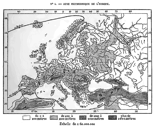 Sous la double influence des courants maritimes et aériens, la température moyenne du continent est tellement accrue qu'à égale latitude, elle dépasse de 5, de 10 et même de 15 degrés celle des autres parties du monde. Nulle part, pas même sur les côtes occidentales de l'Amérique du nord, les isothermes, c'est-à-dire les lignes d'égale chaleur moyenne, ne rapprochent 25 plus leurs courbes de la zone polaire; à 1,500 et 2,000 kilomètres plus loin de l'équateur, on jouit en Europe d'un climat aussi doux qu'en Amérique; en outre, la température y diminue, du sud au nord, beaucoup moins rapidement que dans toute autre partie de la rondeur terrestre. C'est là ce qui distingue, spécialement l'Europe: une par son climat, elle se trouve comprise en entier dans la zone de température modérée, entre les isothermes de 20 et de 0 degrés centigrades, tandis qu'en Amérique et en Asie cette zone privilégiée est deux fois moindre en largeur.