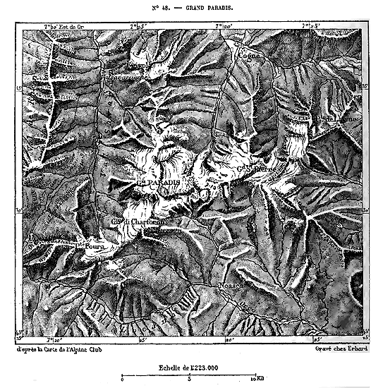 Dans la partie occidentale du système alpin, c'est-à-dire de la Méditerranée au massif du mont Blanc, point culminant de l'Europe, la hauteur moyenne des groupes de montagnes augmente par degrés de 2,000 mètres à plus de 4,000. A l'est du grand bassin angulaire des Alpes, formé par le mont Blanc, le système change de direction; puis, au delà des deux puissantes citadelles du mont Rose et de l'Oberland, il s'abaisse peu à peu. A l'Orient des Alpes suisses, aucune cime n'atteint la hauteur de 4,000 mètres, et l'élévation moyenne des montagnes diminue d'un tiers environ; mais là où la région montagneuse est moins haute, elle devient graduellement plus large à cause de l'écartement des massifs et de la divergence des chaînes. Tandis que l'axe principal continue vers le nord-est la direction des Alpes helvétiques, des chaînes très-considérables, qui doublent l'épaisseur de la masse, se projettent au nord, à l'est et au sud-est. Par le travers de Vienne, les Alpes proprement dites n'ont pas moins de 400 kilomètres de large.