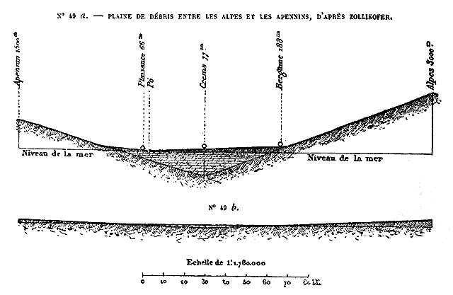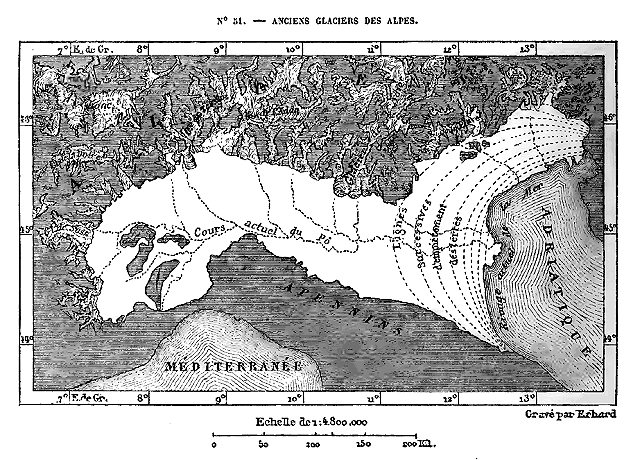 Le système des Alpes, qui doit probablement son vieux nom celtique à la blancheur de ses hautes cimes neigeuses, se développe en une immense courbe de plus de 1,000 kilomètres, des rivages de la Méditerranée au bassin du Danube. Il se compose, en réalité, d'une trentaine de massifs formant autant de groupes géologiques distincts, mais reliés les uns aux autres par des seuils très-élevés; ses roches, qu'elles soient de granit, d'ardoise, de grès ou de calcaires, se maintiennent au-dessus des plaines basses en un rempart continu. Dans les âges antérieurs, les Alpes furent beaucoup plus hautes, ainsi qu'a permis de le constater l'étude des éboulis et des strates à demi détruites par les agents naturels; mais, tout dégradées qu'elles soient, elles élèvent encore des centaines de cimes dans la région des neiges persistantes, et de grands fleuves de glaces s'épanchent de toutes ses hautes crêtes dans les vallées supérieures. Des campagnes du Piémont et de la Lombardie, les glaciers et les névés apparaissent comme un diadème étincelant enroulé sur le sommet des monts.