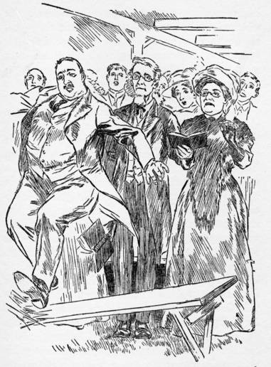 | “Mr. Pomper, thinkin’ he would see better, got up on the bench, and jest as he shouted out ‘How firm a foundation,’ the bench broke and down he come.” | 169 |