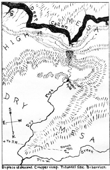 His first impulse was to jump on his pony and ride off. He was about to set his foot in the stirrup when the apprehensive glance with which he was peering around shifted down to the cañon. His gaze traveled back from the near edge of the chasm, up the two hundred yards of slope, and rested on the yearling as though estimating its weight.