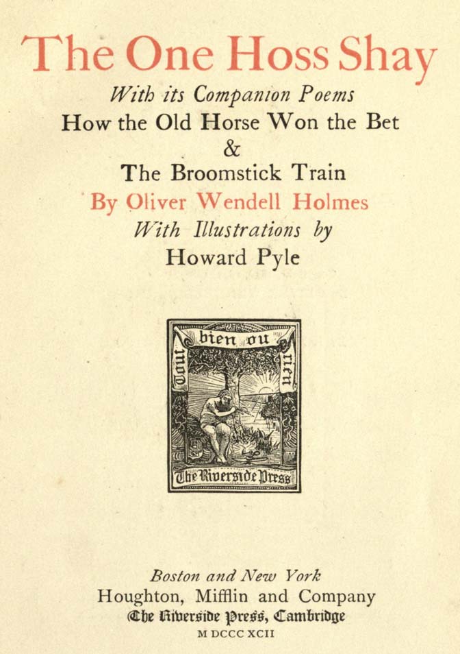 My publishers suggested the bringing together of the three poems here presented to the reader as being to some extent alike in their general character. “The Wonderful One-Hoss Shay” is a perfectly intelligible conception, whatever material difficulties it presents. It is conceivable that a being of an order superior to humanity should so understand the conditions of matter that he could construct a machine which should go to pieces, if not into its constituent atoms, at a given moment of the future. The mind may take a certain pleasure in this picture of the impossible. The event follows as a logical consequence of the presupposed condition of things.