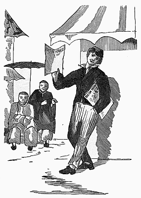 One after another followed with a cry of surprise at some news which they had found; until, in a few minutes, every gentleman in the room was absorbed in reading the papers, appearing to have entirely forgotten all about me, and not caring to ask how it was that I had brought them to China in less than twenty-four hours. After I had stood there whistling carelessly[Pg 19] as long as I thought worth while, I spoke up in a loud voice, and said, "Well, gentlemen, you seem to be enjoying the news pretty well. I hope you don't mean to forget to pay for the papers,—only five dollars a copy!"