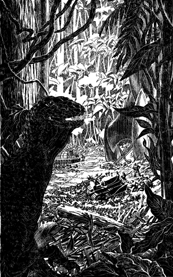 She looked out the window at the 'dozer and crew. Danny Stern was still waving his arms; the log was almost in place. "George and May Wright were killed last night. So was Farelli. If George and May had had a child, the monster would have trampled it too—it went right through their cabin like cardboard. It isn't fair to bring a baby into—"