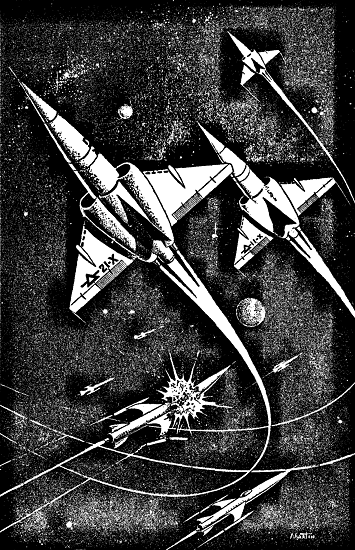 Flight Commander Dennis, Flight One, heard the final word as he sat in the small bubble on top of the dense package of machinery that was a P-ship. Swiftly, his hands closed switches. The course had already been chosen and fed into the automatic computers under him. He merely gave the signal to execute. In response, the ship seemed to pick itself up and hurl itself down the radius of the circle to the waiting enemy fleet.