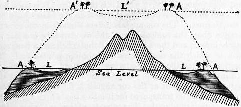 A, A, outer edges of the barrier reef at the sea-level; the coco-nut trees indicate dry land formed on the edges of the reef.