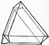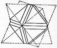 Scientific Characters.—The majority of minerals are found most commonly in masses which can with difficulty be recognized as aggregates of crystalline grains, and occur comparatively seldom as distinct crystals; but the diamond is almost always found in single crystals, which show no signs of previous attachment to any matrix; the stones were, until the discovery of the South African mines, almost entirely derived from sands or gravels, but owing to the hardness of the mineral it is rarely, if ever, water-worn, and the crystals are often very perfect. The crystals belong to the cubic system, generally assuming the form of the octahedron (fig. 1), but they may, in accordance with the principles of crystallography, also occur in other forms symmetrically derived from the octahedron,—for example, the cube, the 12-faced figure known as the rhombic dodecahedron (fig. 2), or the 48-faced figure known as the hexakis-octahedron (fig. 3), or in combinations of these. The octahedron faces are usually smooth; most of the other faces are rounded (fig. 4). The cube faces are rough with protruding points. The cube is sometimes found in Brazil, but is very rare among the S. African stones; and the dodecahedron is perhaps more common in Brazil than elsewhere. There is often a furrow running along the edges of the octahedron, or across the edges of the cube, and this indicates that the apparently simple crystal may really consist of eight individuals meeting at the centre; or, what comes to the same thing, of two individuals interpenetrating and projecting through each other. If this be so the form of the diamond is really the tetrahedron (and the various figures derived symmetrically from it) and not the octahedron Fig. 5 shows how the octahedron with furrowed edge may be constructed from two interpenetrating tetrahedra (shown in dotted lines). If the grooves be left out of account, the large faces which have replaced each tetrahedron corner then make up a figure which has the aspect of a simple octahedron. Such regular interpenetrations are known in crystallography as “twins.” There are also twins of diamond in which two octahedra (fig. 6) are united by contact along a surface parallel to an octahedron face without interpenetration. On account of their resemblance to the twins of the mineral spinel (which crystallizes in octahedra) these are known as “spinel twins.” They are generally flattened along the plane of union. The crystals often display triangular markings, either elevations or pits, upon the octahedron faces; the latter are particularly well defined and have the form of equilateral triangles (fig. 7). They are similar to the “etched figures” produced by moistening an octahedron of alum, and have probably been produced, like them, by the action of some solvent. Similar, but somewhat different markings are produced by the combustion of diamond in oxygen, unaccompanied by any rounding of the edges.