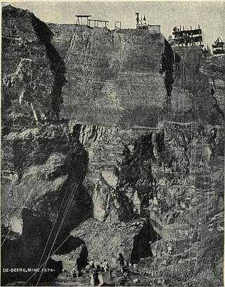 In a very few years, however, the open pit mining was rendered impossible by the mud rushes, by the falls of the masses of barren rock known as “reef,” which were left standing in the mine, and by landslips from the sides, so that in 1883, when the pit had reached a depth of about 400 ft., mining in the Kimberley crater had become almost impossible. By 1889, in the whole group of mines, Kimberley, Dutoitspan, De Beers and Bultfontein, open pit working was practically abandoned. Meanwhile mining below the bottom of the pits by means of shafts and underground tunnels had been commenced; but the full development of modern methods dates from the year 1889 when Cecil Rhodes and Alfred Beit, who had already secured control of the De Beers mine, acquired also the control of the Kimberley mine, and shortly afterwards consolidated the entire group in the hands of the De Beers Company. (See Kimberley.)