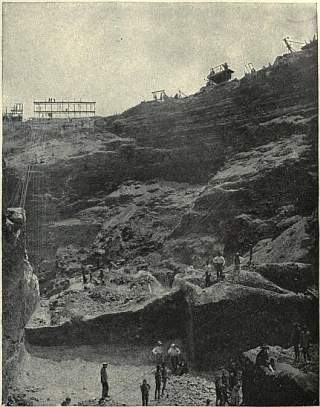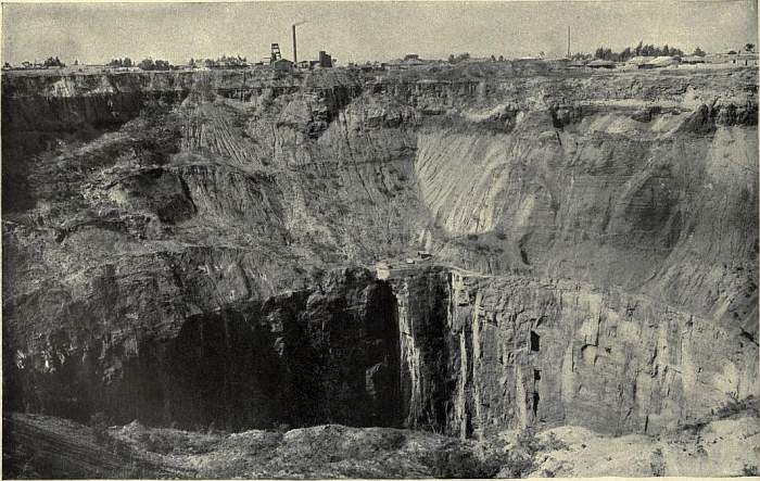 The scene of native mining was now transferred from the open pit to underground tunnels; the vast network of wire ropes (Plate II. fig. 12) with their ascending and descending buckets disappeared, and with it the cosmopolitan crowd of busy miners working like ants at the bottom of the pit. In place of all this, the visitor to Kimberley encounters at the edge of the town only a huge crater, silent and apparently deserted, with no visible sign of the great mining operations which are conducted nearly half a mile below the surface. The aspect of the Kimberley pit in 1906 is shown in fig. 13 of Plate II., which may be compared with the section of fig. 8.