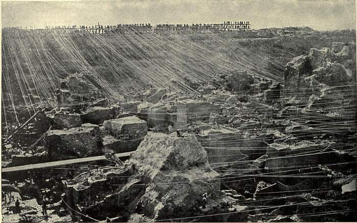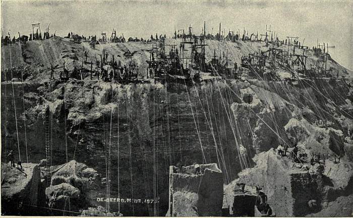 It was soon found that each mine was in reality a huge vertical funnel or crater descending to an unknown depth, and filled with diamantiferous blue ground. At first each claim was an independent pit 31 ft. square sunk into the blue ground; the diamantiferous rock was hoisted by bucket and windlass, and roadways were left across the pit to provide access to the claims. But the roadways soon fell in, and ultimately haulage from the claims could only be provided by means of a vast system of wire ropes extending from a triple staging of windlasses erected round the entire edge of the mine, which had by this time become a huge open pit; the ropes from the upper windlasses extended to the centre, and those from the lower tier to the sides of the pit; covering the whole mass like a gigantic cobweb. (See Plate II. fig. 12.) The buckets of blue ground were hauled up these ropes by means of horse whims, and in 1875 steam winding engines began to be employed. By this time also improved methods in the treatment of the blue ground were introduced. It was carried off in carts to open spaces, where an exposure of some weeks to the air was found to pulverize the hard rock far more efficiently than the old method of crushing with mallets. The placer-miner’s cradle and rocking-trough were replaced by puddling troughs stirred by a revolving comb worked by horse power; reservoirs were constructed for the scanty water-supply, bucket elevators were introduced to carry away the tailings; and the natives were confined in compounds. For these improvements co-operation was necessary; the better claims, which in 1872 had risen from £100 to more than £4000 in value, began to be consolidated, and a Mining Board was introduced.