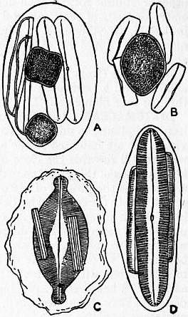 None of the inclusions in the diamond gives any clue to its origin; diamond itself has been found as an inclusion, as have also black specks of some carbonaceous materials. Other black specks have been identified as haematite and ilmenite; gold has also been found; other included minerals recorded are rutile, topaz, quartz, pyrites, apophyllite, and green scales of chlorite (?). Some of these are of very doubtful identification; others (e.g. apophyllite and chlorite) may have been introduced along cracks. Some of the fibrous inclusions were identified by H. R. Göppert as vegetable structures and were supposed to point to an organic origin, but this view is no longer held. Liquid inclusions, some of which are certainly carbon dioxide, have also been observed.