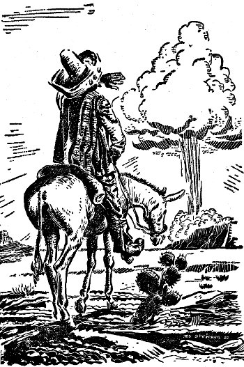 "—on the strength of reports now in, it appears the enemy bungled badly. Instead of crippling the nation, they succeeded only in alerting it. The bombs—at this time there appear to have been five of them dropped—formed a straight north-south line across western United States. One detonated close to the Idaho-Utah line. The other four were placed at almost equi-distant points to the south—the fifth bomb, according to first reports, exploding in a Mexican desert. We have been informed that Calas, Utah, a town of nine hundred persons, has been completely annihilated. For further reports, keep tuned to this station."