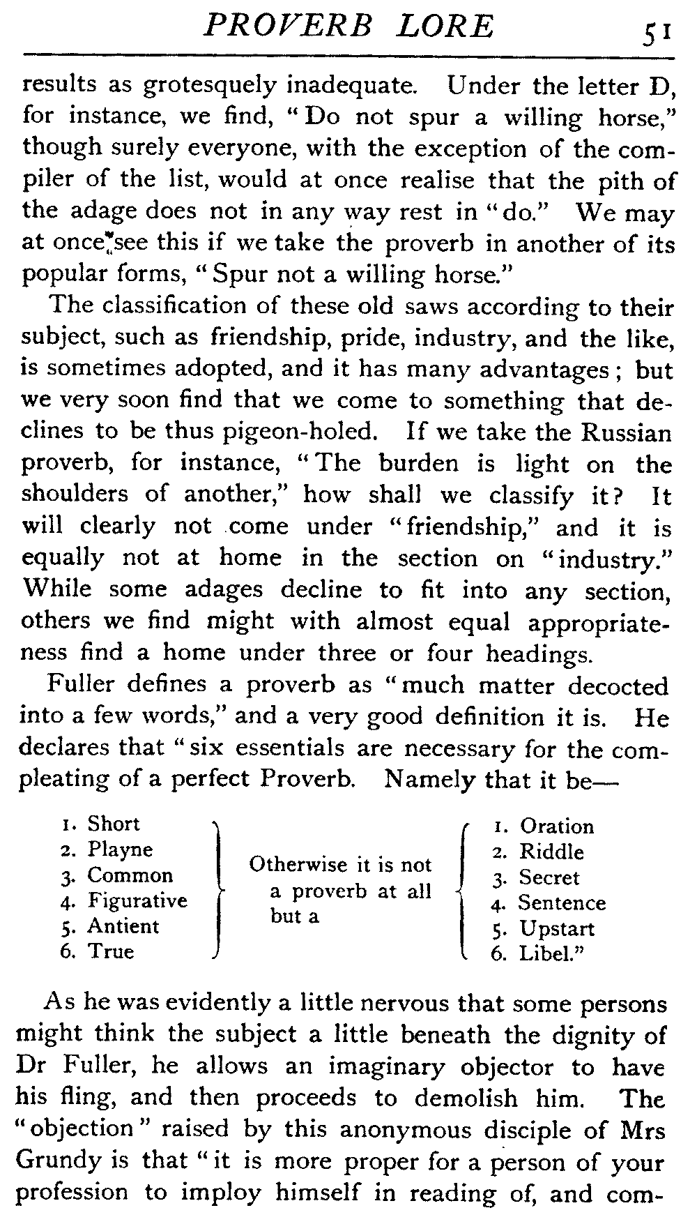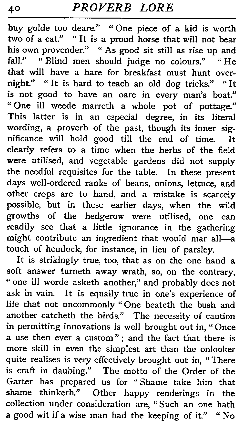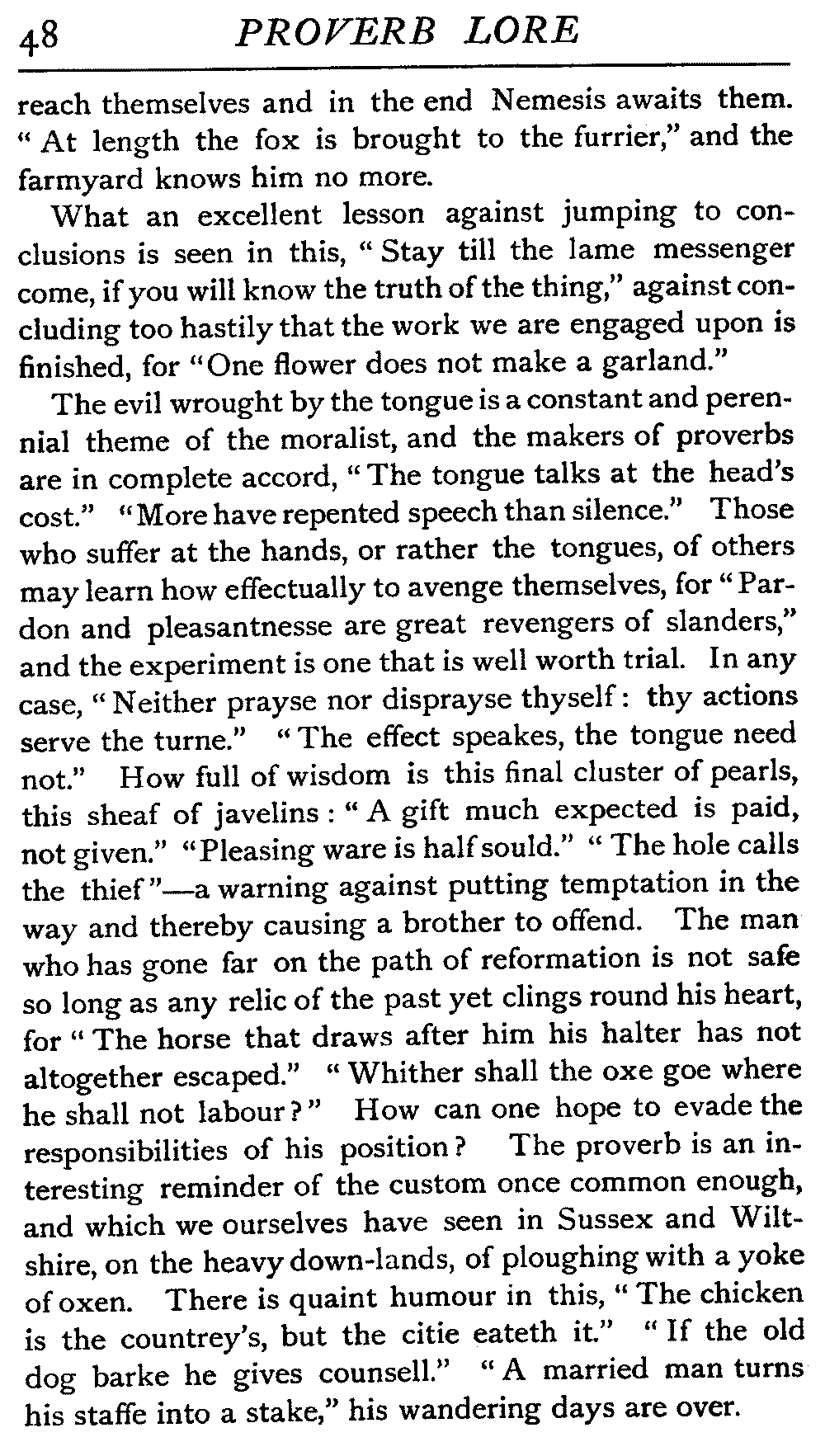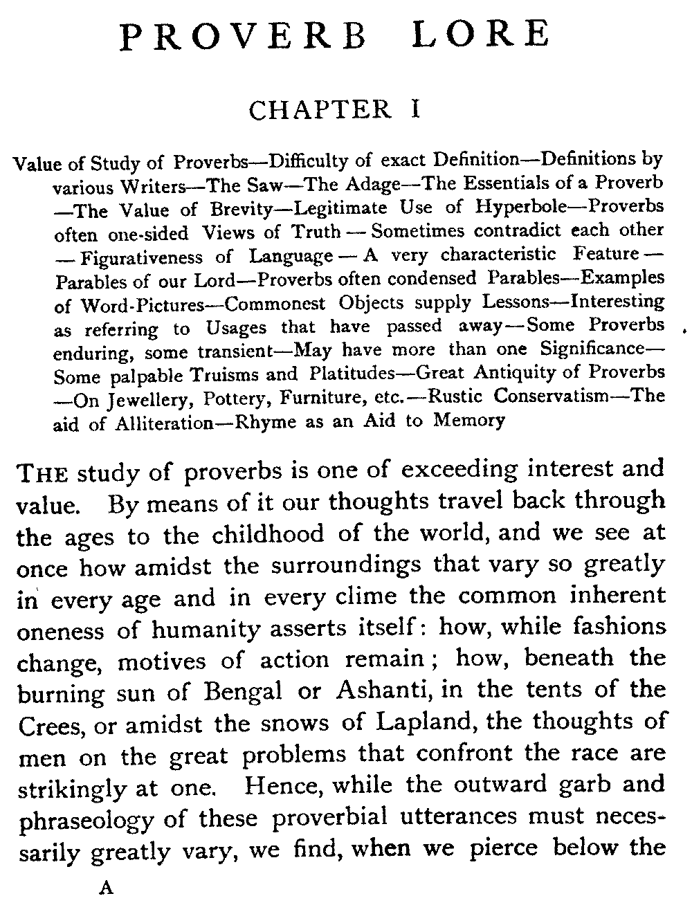 Value of Study of Proverbs—Difficulty of exact Definition—Definitions by various Writers—The Saw—The Adage—The Essentials of a Proverb—The Value of Brevity—Legitimate Use of Hyperbole—Proverbs often one-sided Views of Truth—Sometimes contradict each other—Figurativeness of Language—A very characteristic Feature—Parables of our Lord—Proverbs often condensed Parables—Examples of Word-Pictures—Commonest Objects supply Lessons—Interesting as referring to Usages that have passed away—Some Proverbs enduring, some transient—May have more than one Significance—Some palpable Truisms and Platitudes—Great Antiquity of Proverbs—On Jewellery, Pottery, Furniture, etc.—Rustic Conservatism—The aid of Alliteration—Rhyme as an Aid to Memory