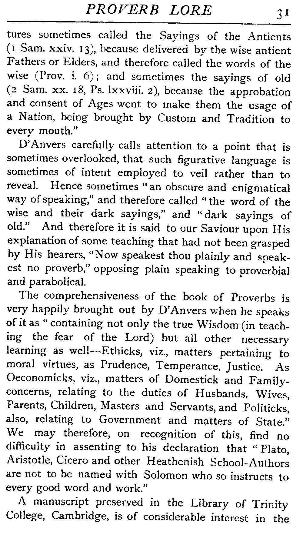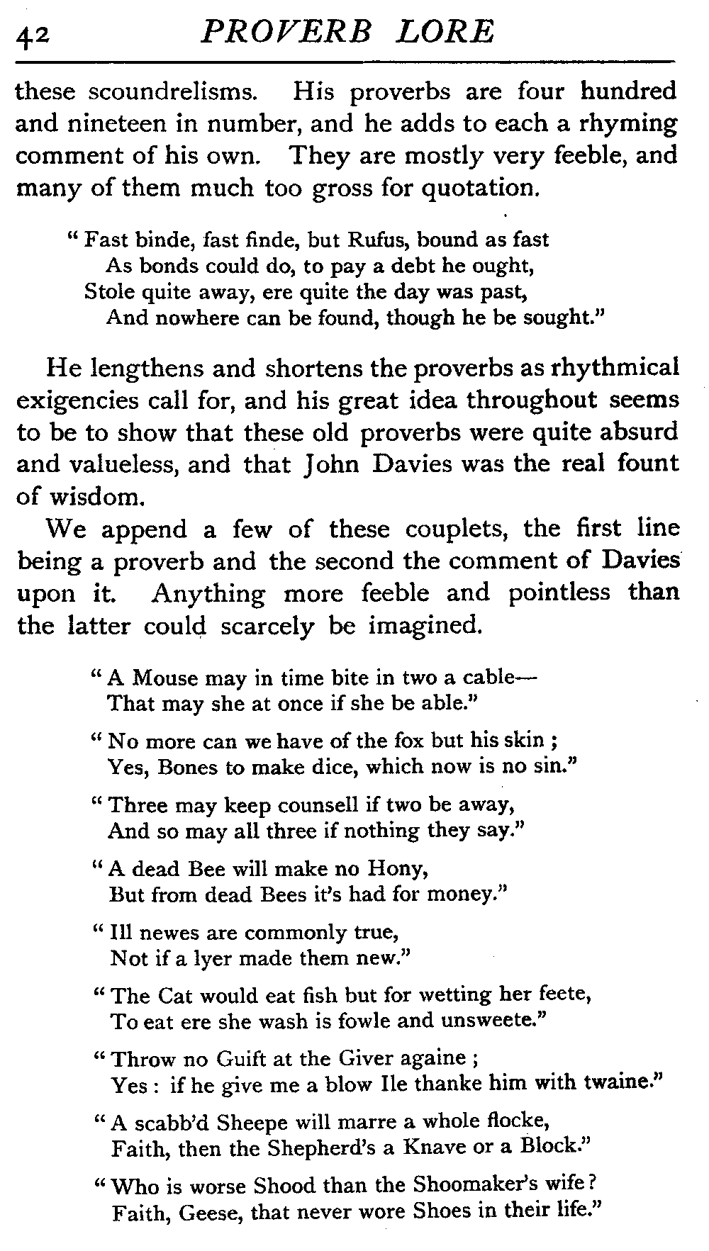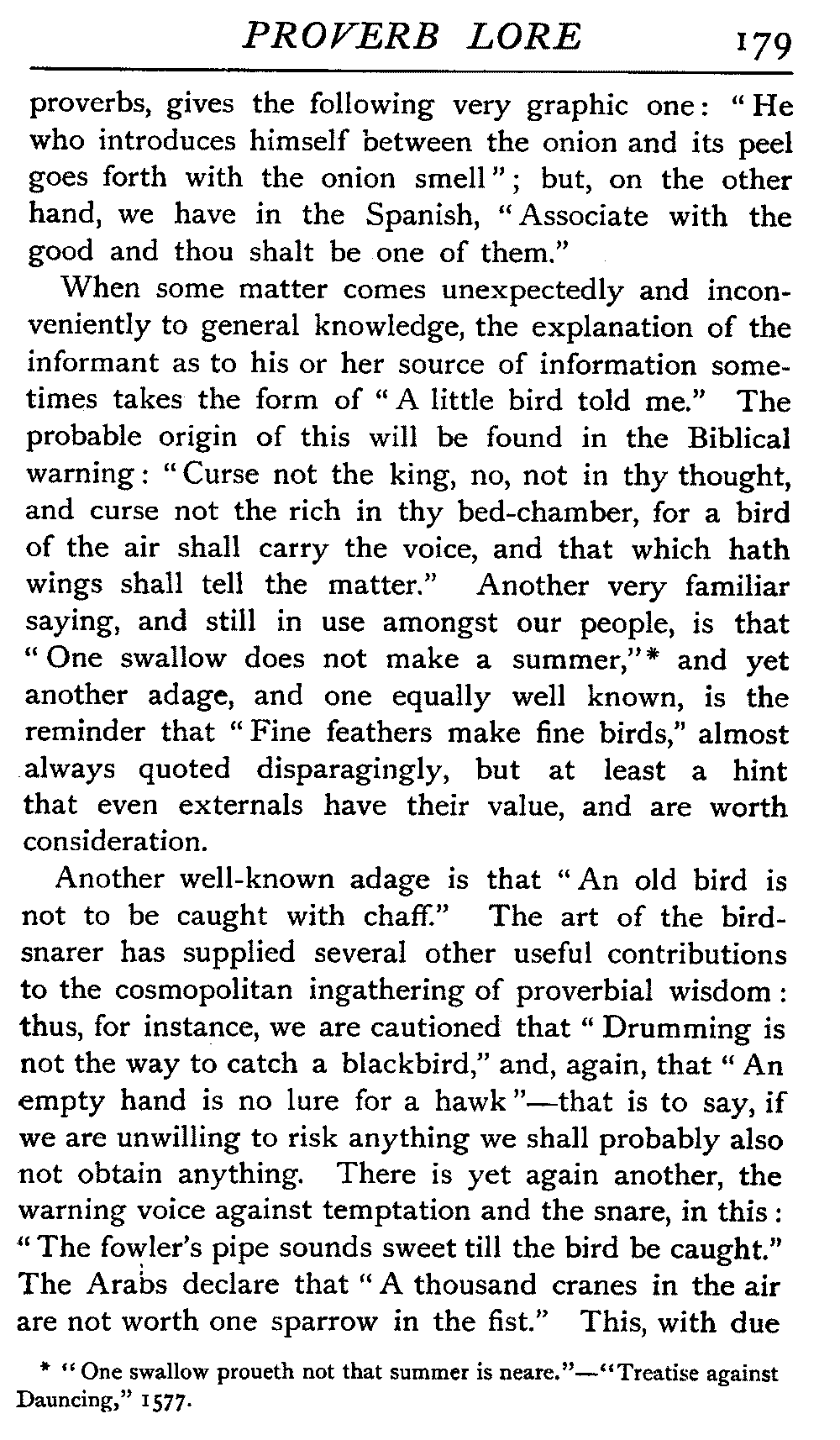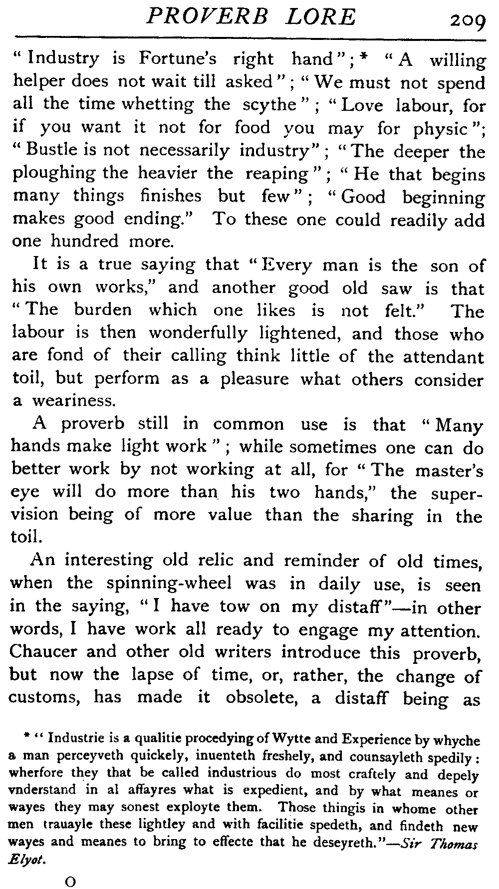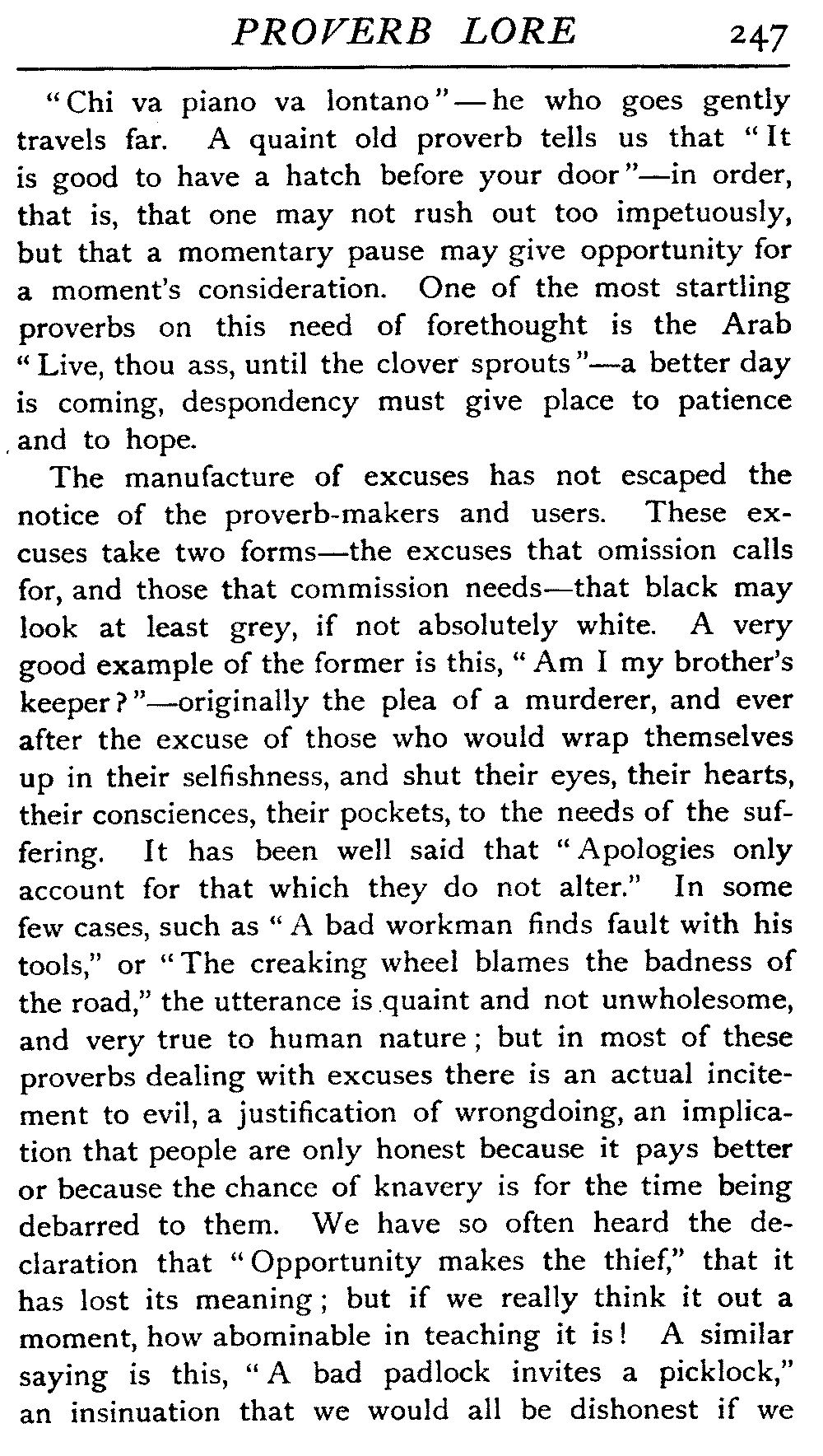 Value of Study of Proverbs—Difficulty of exact Definition—Definitions by various Writers—The Saw—The Adage—The Essentials of a Proverb—The Value of Brevity—Legitimate Use of Hyperbole—Proverbs often one-sided Views of Truth—Sometimes contradict each other—Figurativeness of Language—A very characteristic Feature—Parables of our Lord—Proverbs often condensed Parables—Examples of Word-Pictures—Commonest Objects supply Lessons—Interesting as referring to Usages that have passed away—Some Proverbs enduring, some transient—May have more than one Significance—Some palpable Truisms and Platitudes—Great Antiquity of Proverbs—On Jewellery, Pottery, Furniture, etc.—Rustic Conservatism—The aid of Alliteration—Rhyme as an Aid to Memory