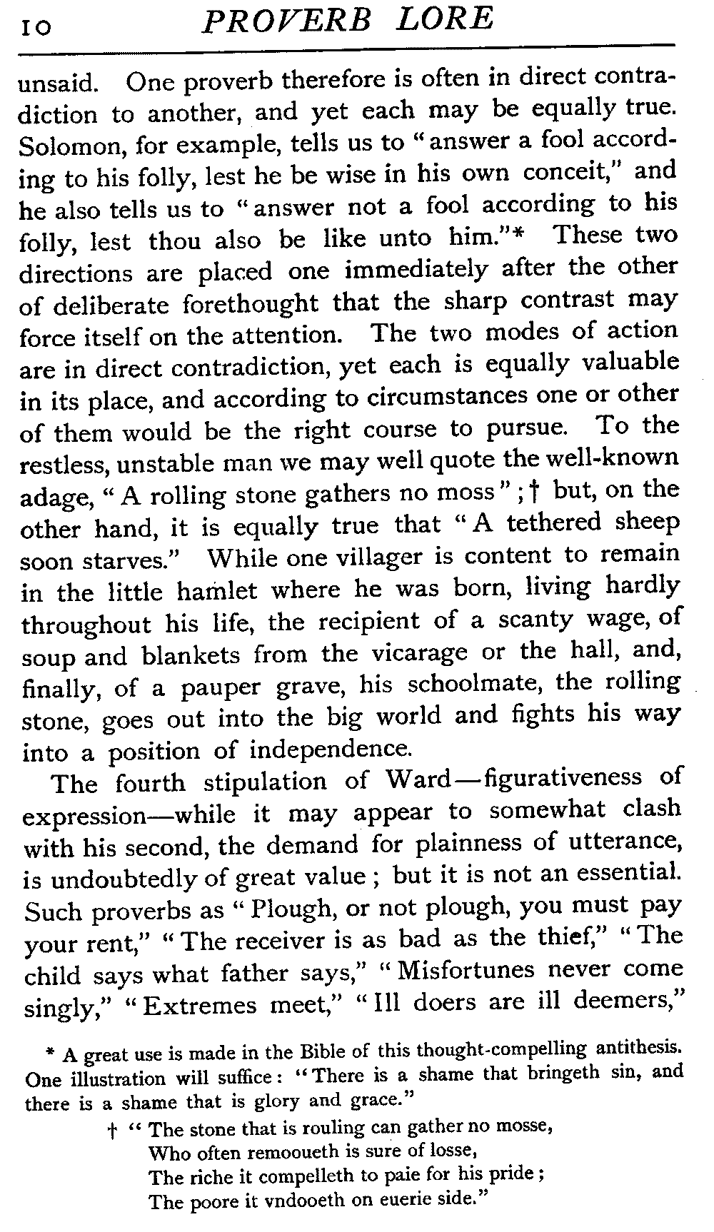 Proverbial wisdom, it must be borne in mind, deals sometimes with only one aspect of a truth. The necessary brevity often makes the teaching one-sided, as the various limitations and exceptions that may be necessary to a complete statement of a truth are perforce left [10]unsaid. One proverb therefore is often in direct contradiction to another, and yet each may be equally true. Solomon, for example, tells us to "answer a fool according to his folly, lest he be wise in his own conceit," and he also tells us to "answer not a fool according to his folly, lest thou also be like unto him."[10:A] These two directions are placed one immediately after the other of deliberate forethought that the sharp contrast may force itself on the attention. The two modes of action are in direct contradiction, yet each is equally valuable in its place, and according to circumstances one or other of them would be the right course to pursue. To the restless, unstable man we may well quote the well-known adage, "A rolling stone gathers no moss";[10:B] but, on the other hand, it is equally true that "A tethered sheep soon starves." While one villager is content to remain in the little hamlet where he was born, living hardly throughout his life, the recipient of a scanty wage, of soup and blankets from the vicarage or the hall, and, finally, of a pauper grave, his schoolmate, the rolling stone, goes out into the big world and fights his way into a position of independence.