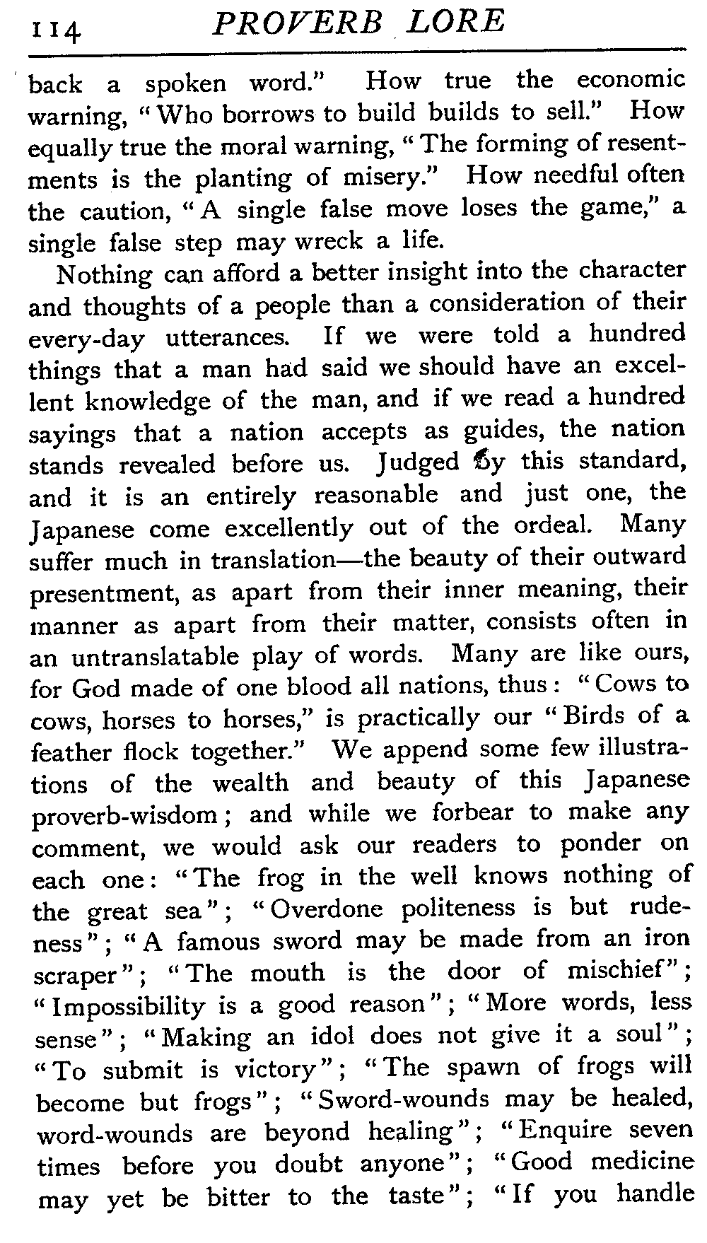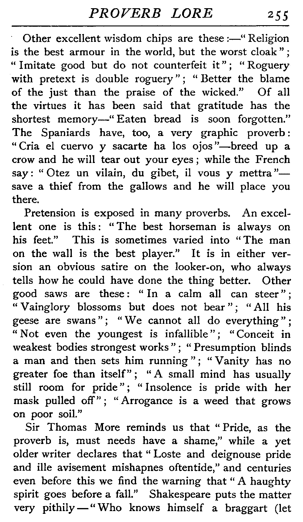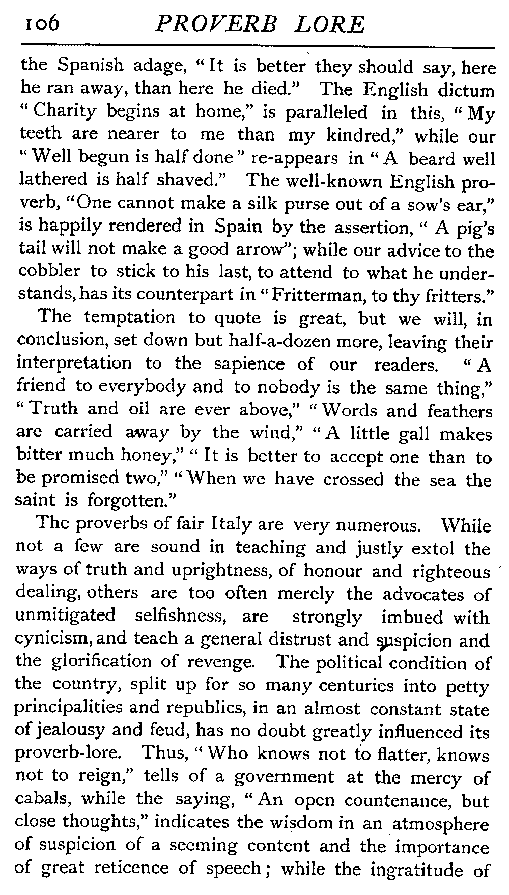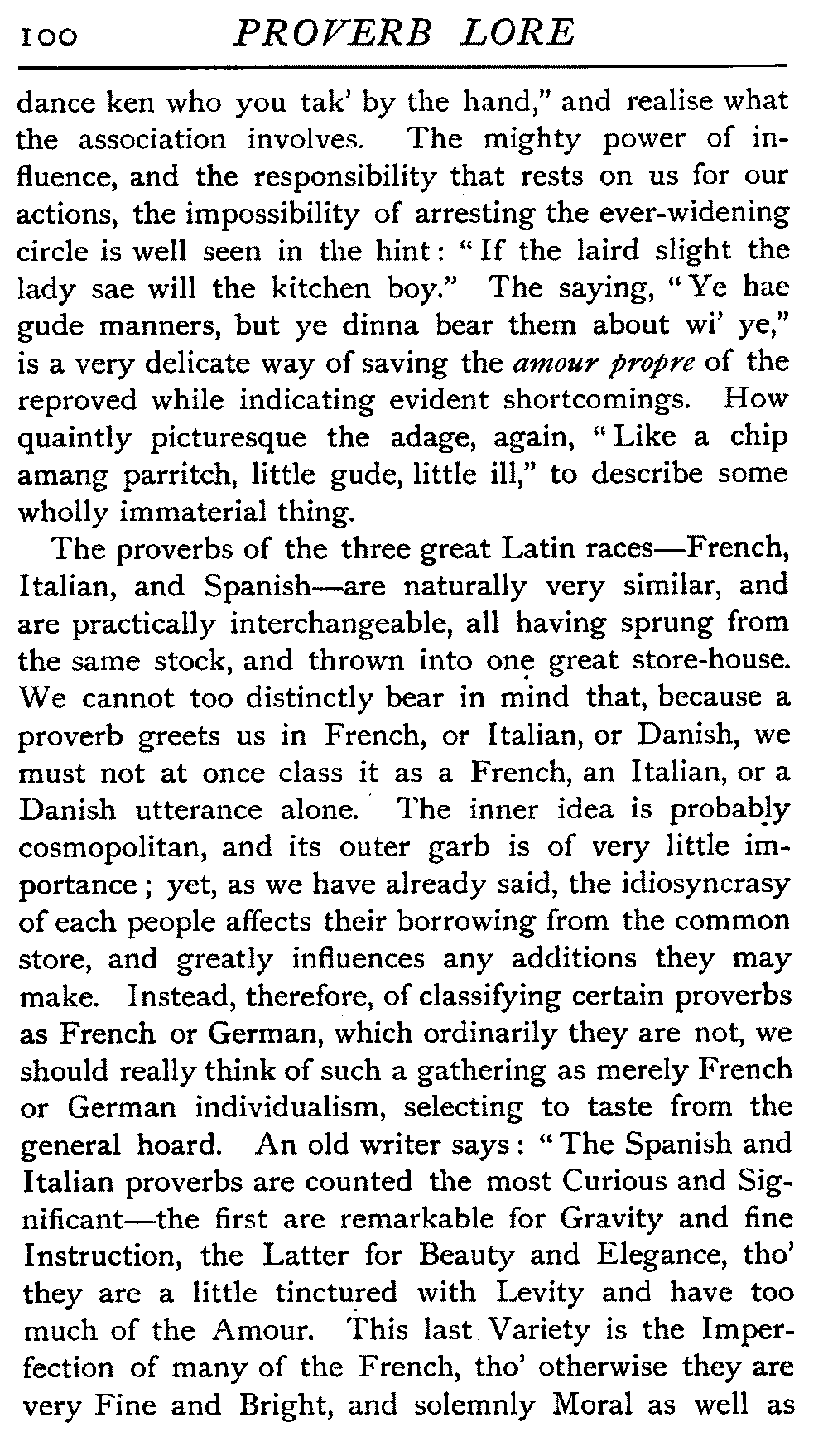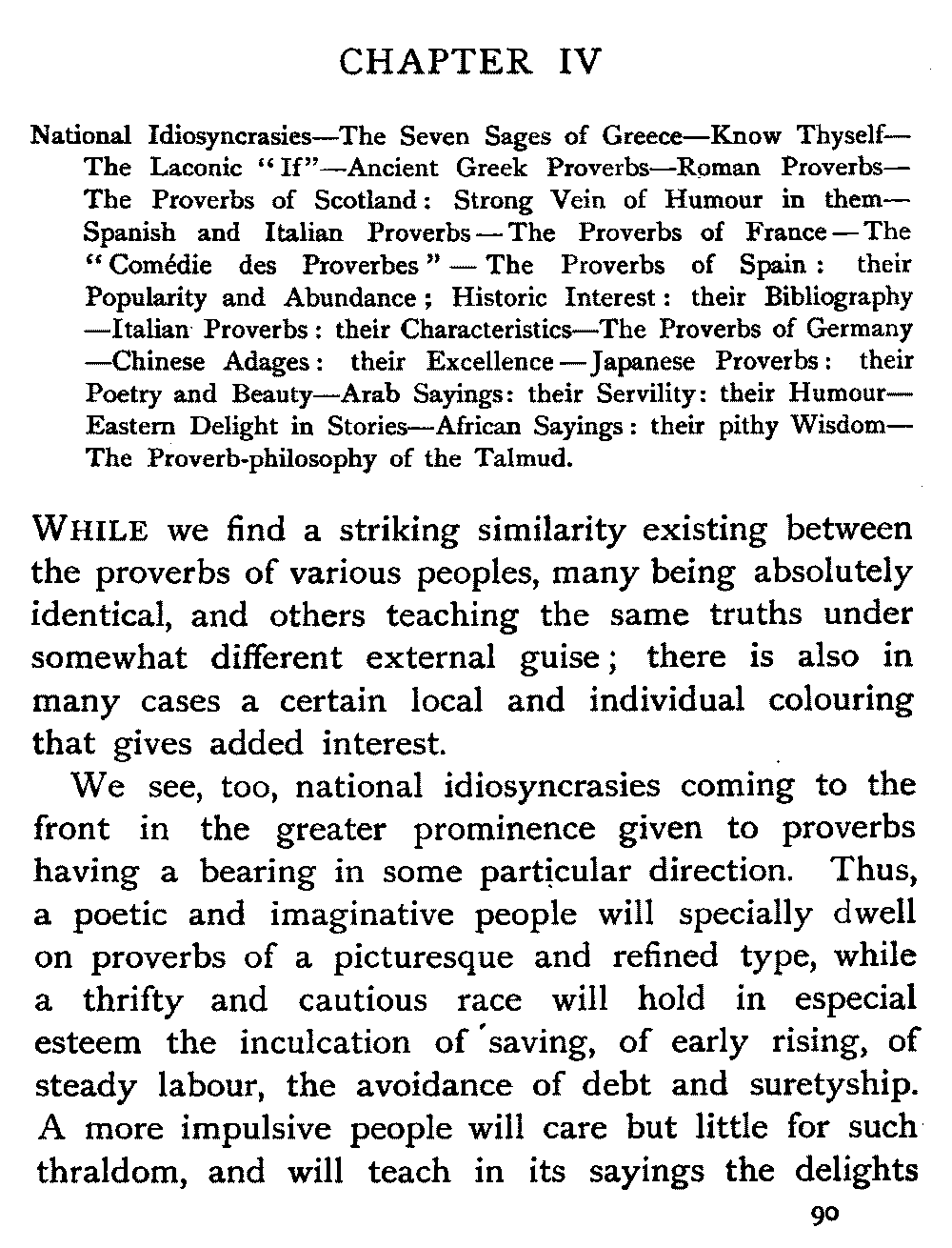 | National Idiosyncrasies—The Seven Sages of Greece—Know Thyself—The Laconic "If"—Ancient Greek Proverbs—Roman Proverbs—The Proverbs of Scotland: Strong Vein of Humour in them—Spanish and Italian Proverbs—The Proverbs of France—The "Comédie des Proverbes"—The Proverbs of Spain: their Popularity and Abundance; Historic Interest: their Bibliography—Italian Proverbs: their Characteristics—The Proverbs of Germany—Chinese Adages: their Excellence—Japanese Proverbs: their Poetry and Beauty—Arab Sayings: their Servility: their Humour—Eastern Delight in Stories—African Sayings: their pithy Wisdom—The Proverb-philosophy of the Talmud | 90 |