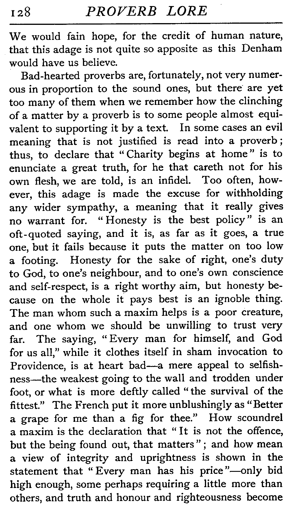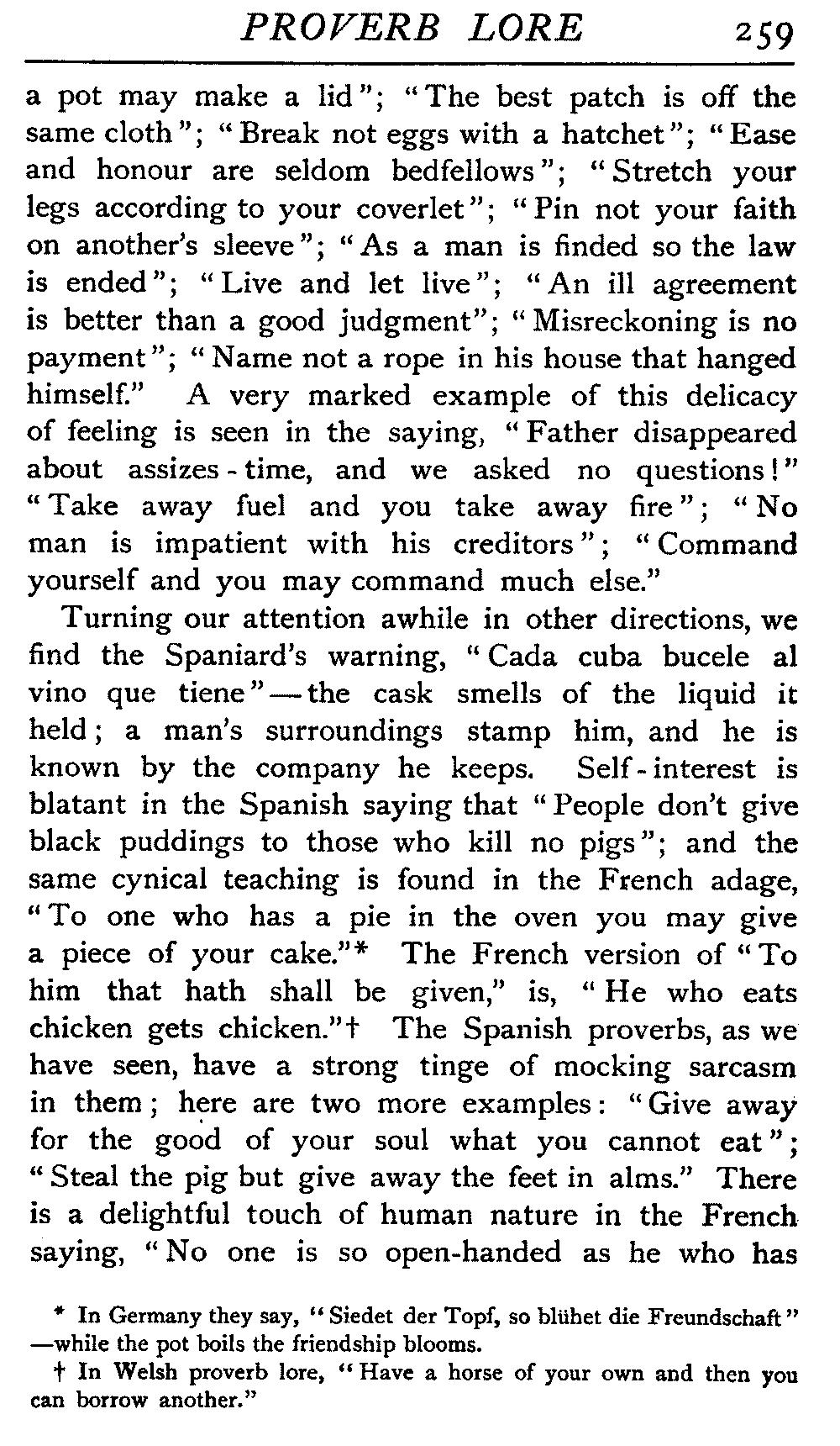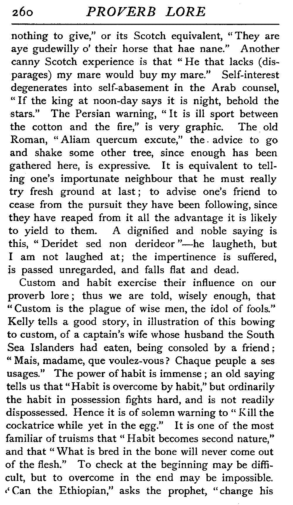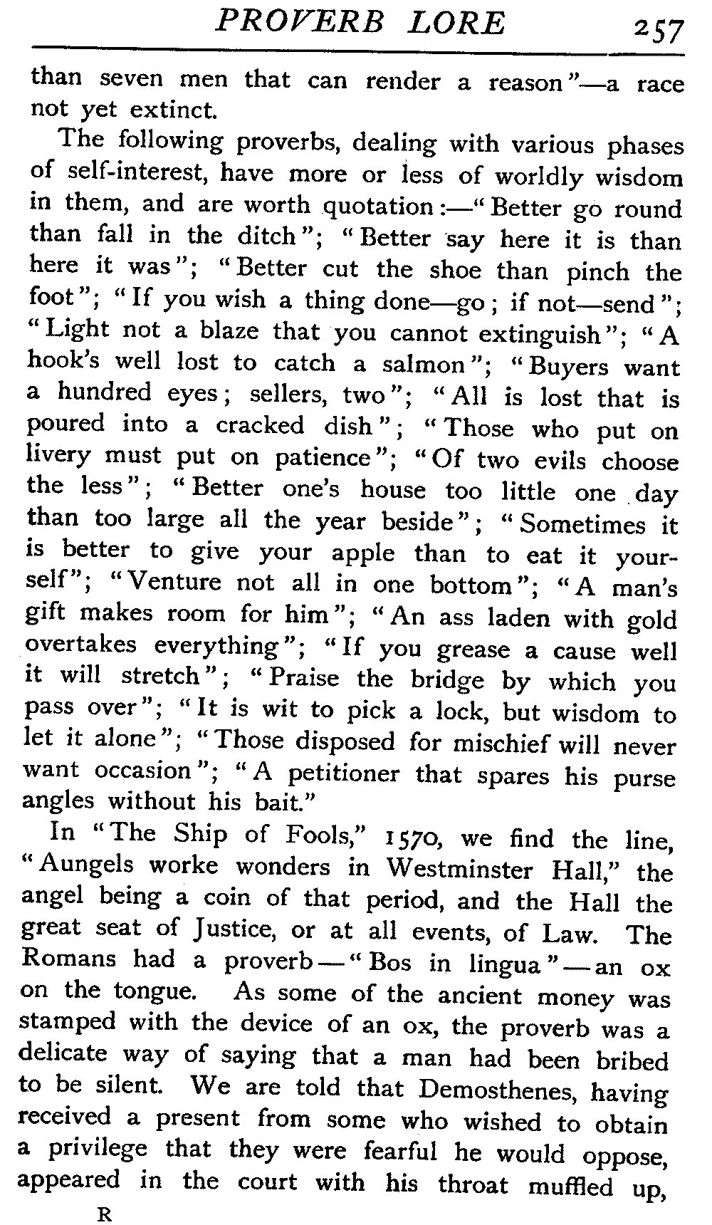 | National Idiosyncrasies—The Seven Sages of Greece—Know Thyself—The Laconic "If"—Ancient Greek Proverbs—Roman Proverbs—The Proverbs of Scotland: Strong Vein of Humour in them—Spanish and Italian Proverbs—The Proverbs of France—The "Comédie des Proverbes"—The Proverbs of Spain: their Popularity and Abundance; Historic Interest: their Bibliography—Italian Proverbs: their Characteristics—The Proverbs of Germany—Chinese Adages: their Excellence—Japanese Proverbs: their Poetry and Beauty—Arab Sayings: their Servility: their Humour—Eastern Delight in Stories—African Sayings: their pithy Wisdom—The Proverb-philosophy of the Talmud | 90 |