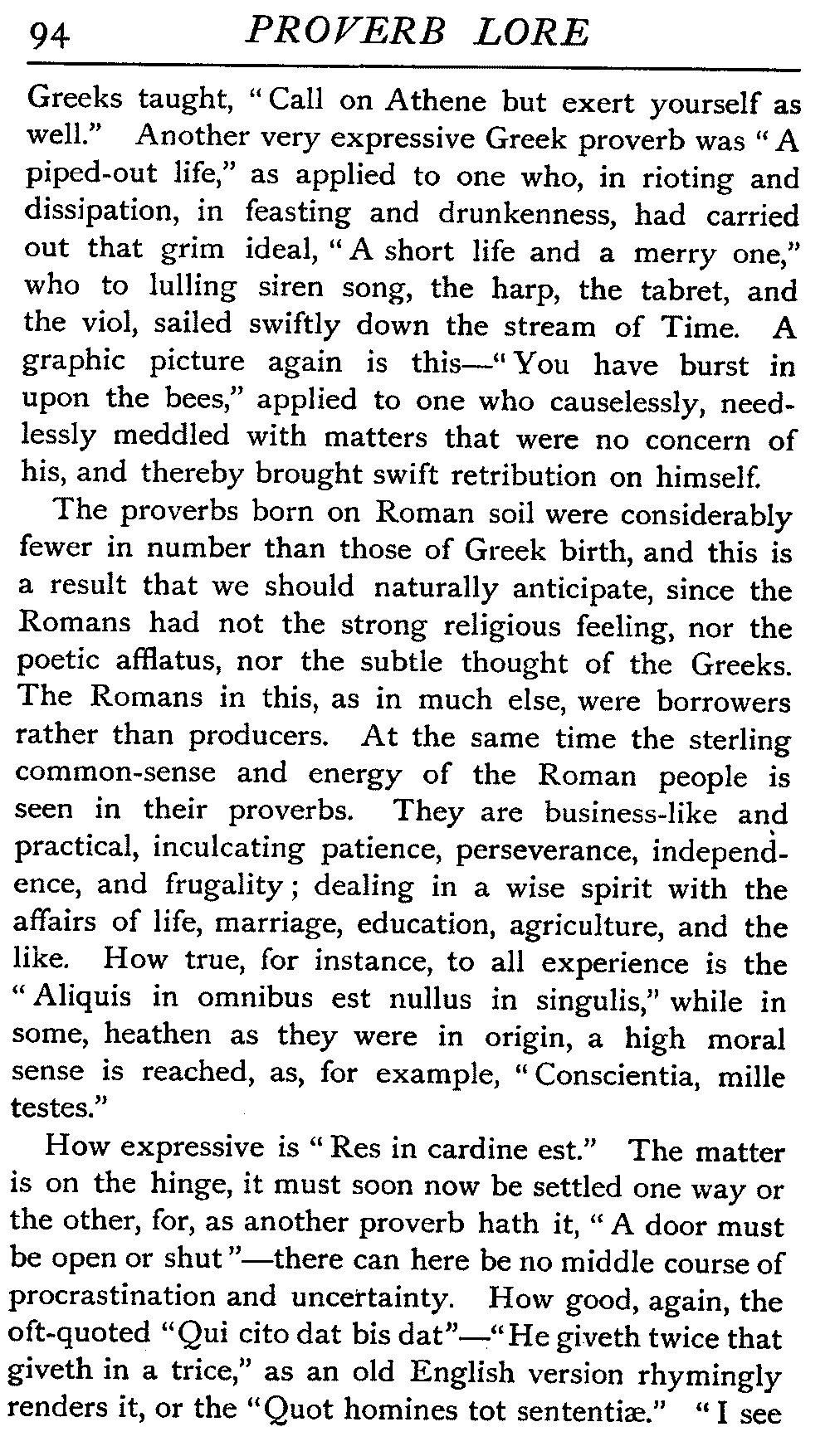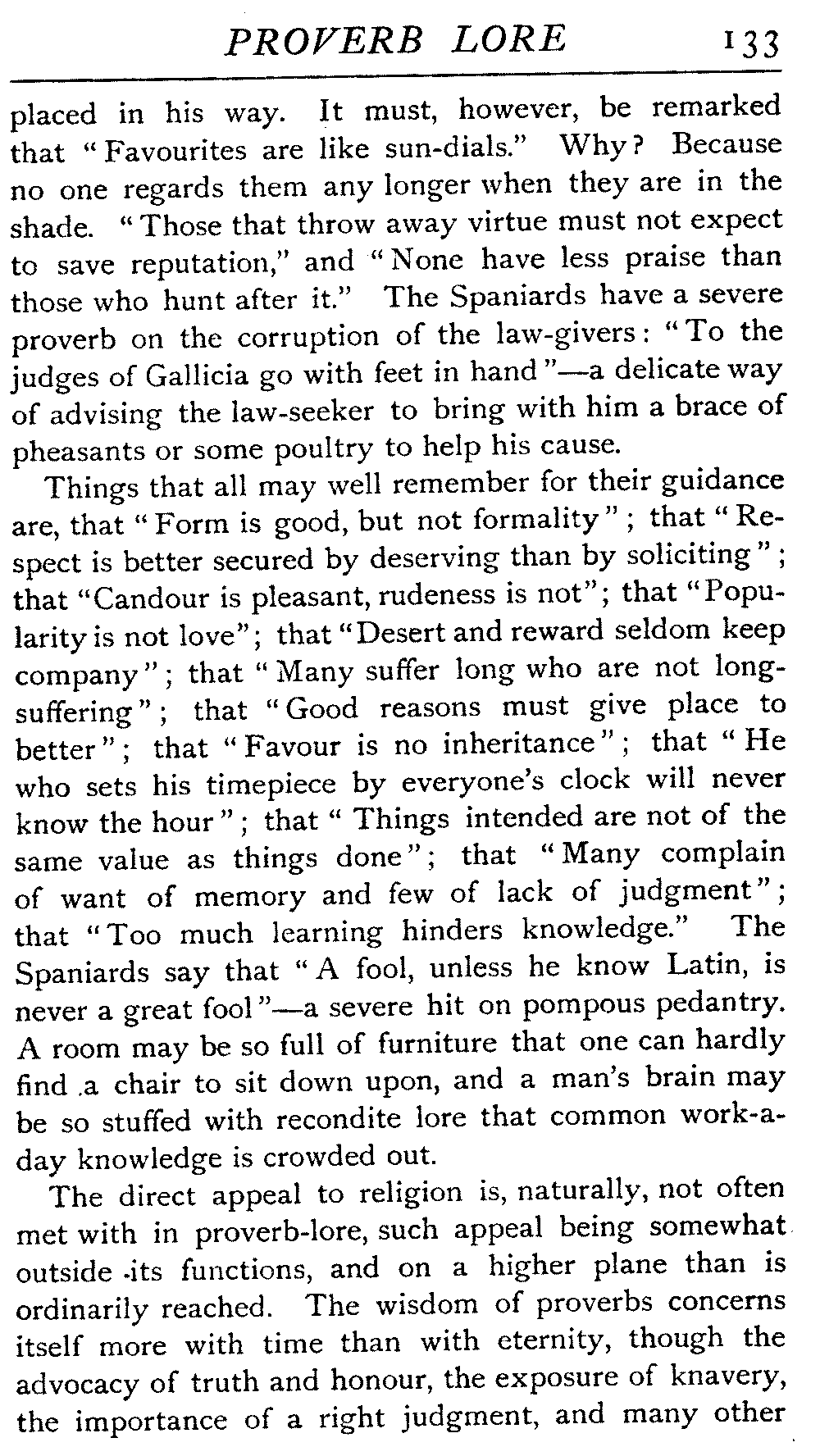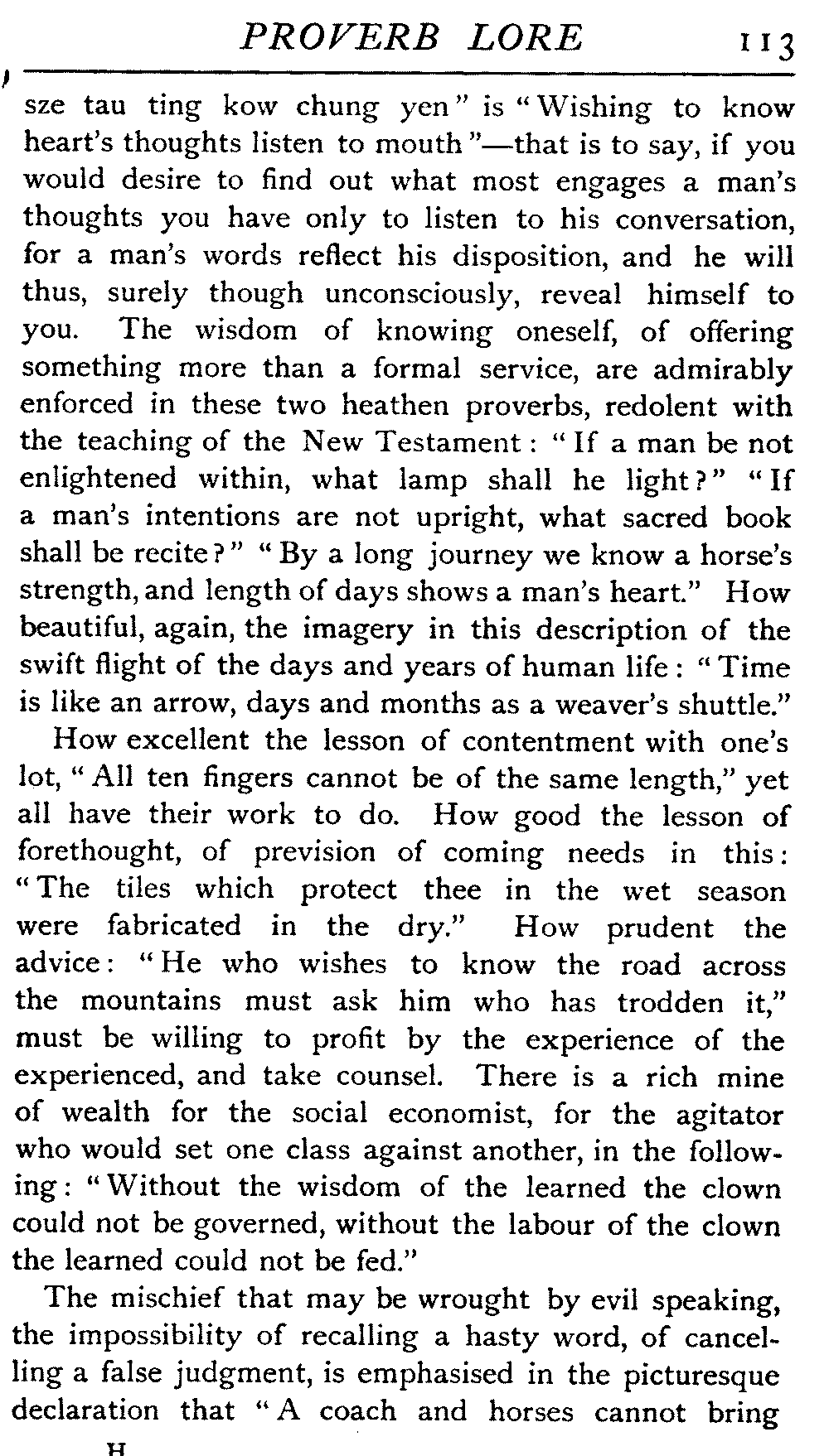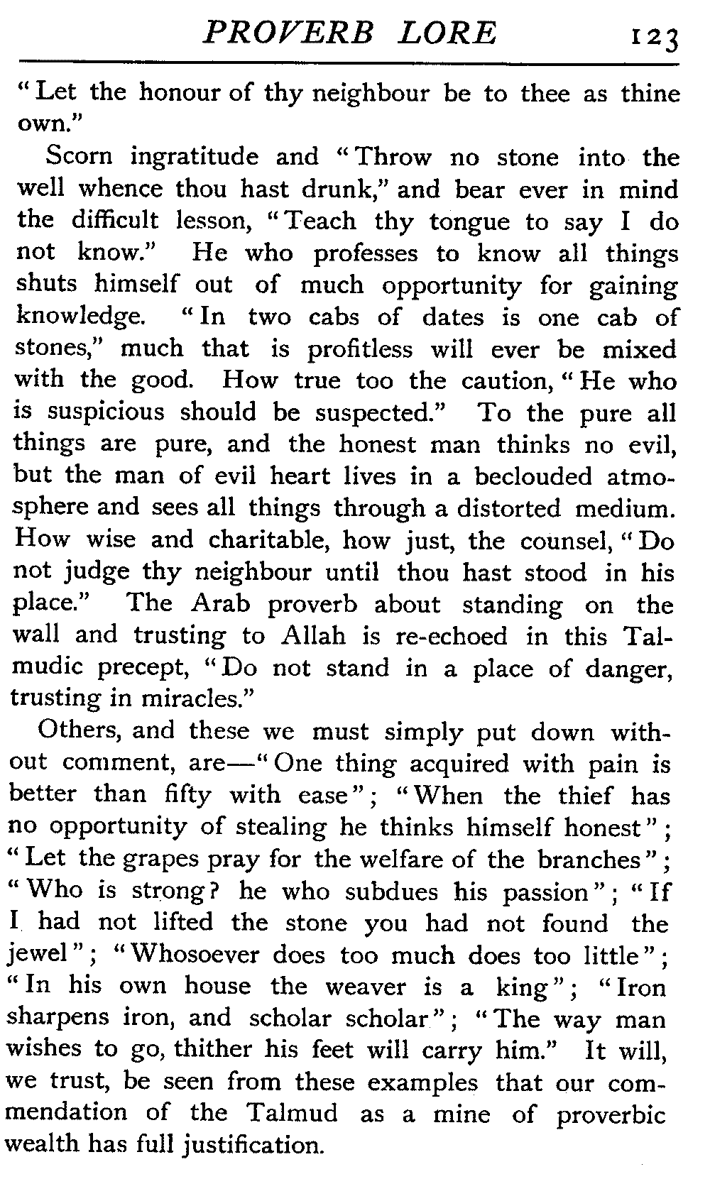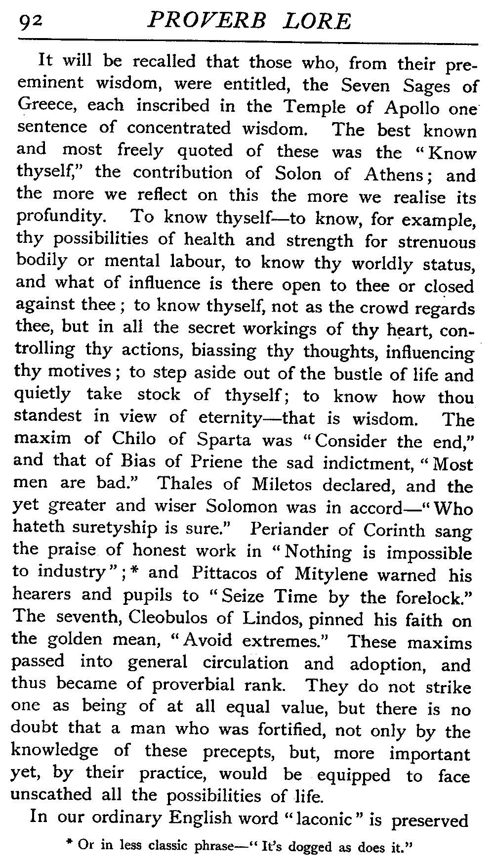 | National Idiosyncrasies—The Seven Sages of Greece—Know Thyself—The Laconic "If"—Ancient Greek Proverbs—Roman Proverbs—The Proverbs of Scotland: Strong Vein of Humour in them—Spanish and Italian Proverbs—The Proverbs of France—The "Comédie des Proverbes"—The Proverbs of Spain: their Popularity and Abundance; Historic Interest: their Bibliography—Italian Proverbs: their Characteristics—The Proverbs of Germany—Chinese Adages: their Excellence—Japanese Proverbs: their Poetry and Beauty—Arab Sayings: their Servility: their Humour—Eastern Delight in Stories—African Sayings: their pithy Wisdom—The Proverb-philosophy of the Talmud | 90 |