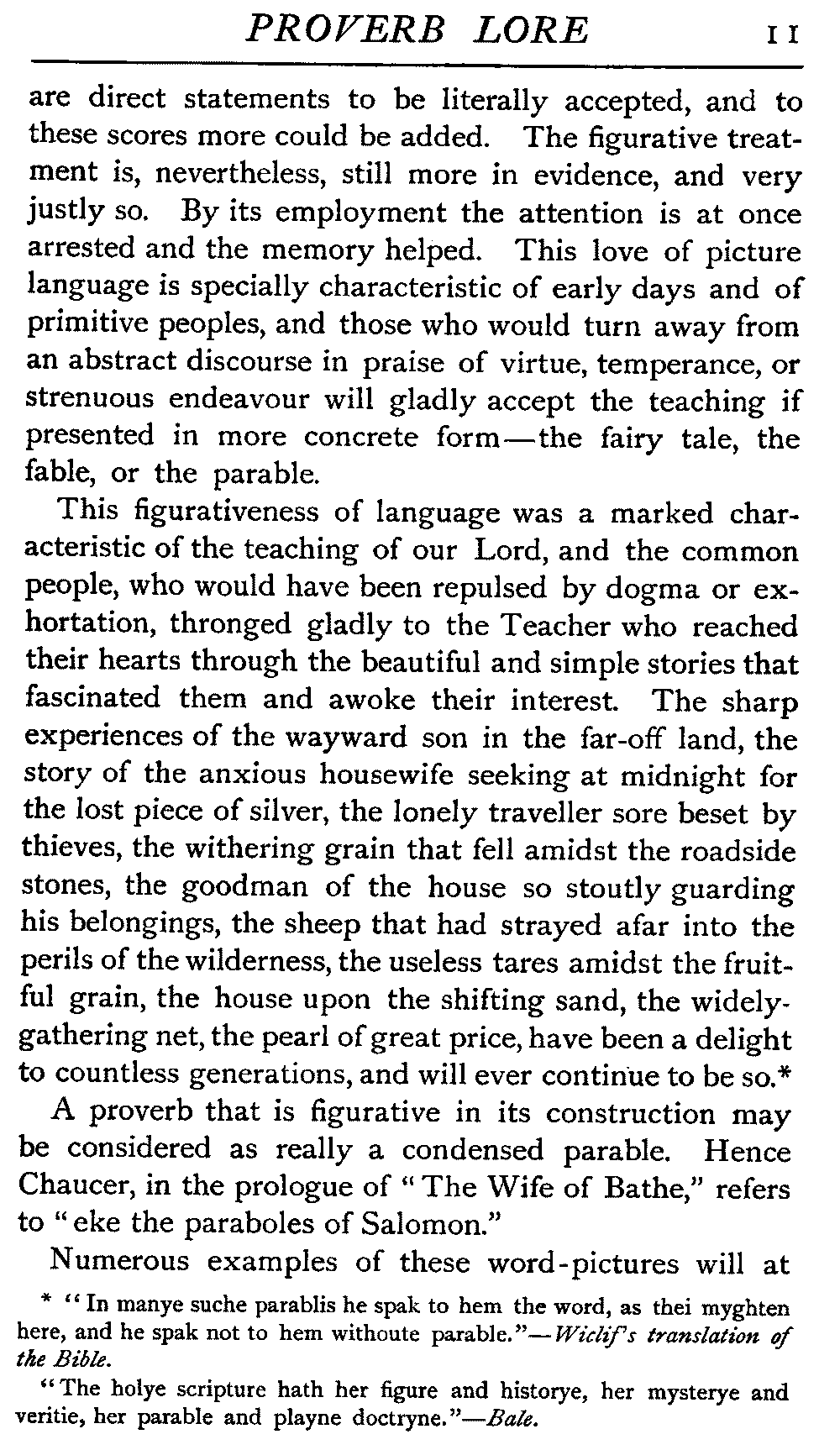 A proverb that is figurative in its construction may be considered as really a condensed parable. Hence Chaucer, in the prologue of "The Wife of Bathe," refers to "eke the paraboles of Salomon."