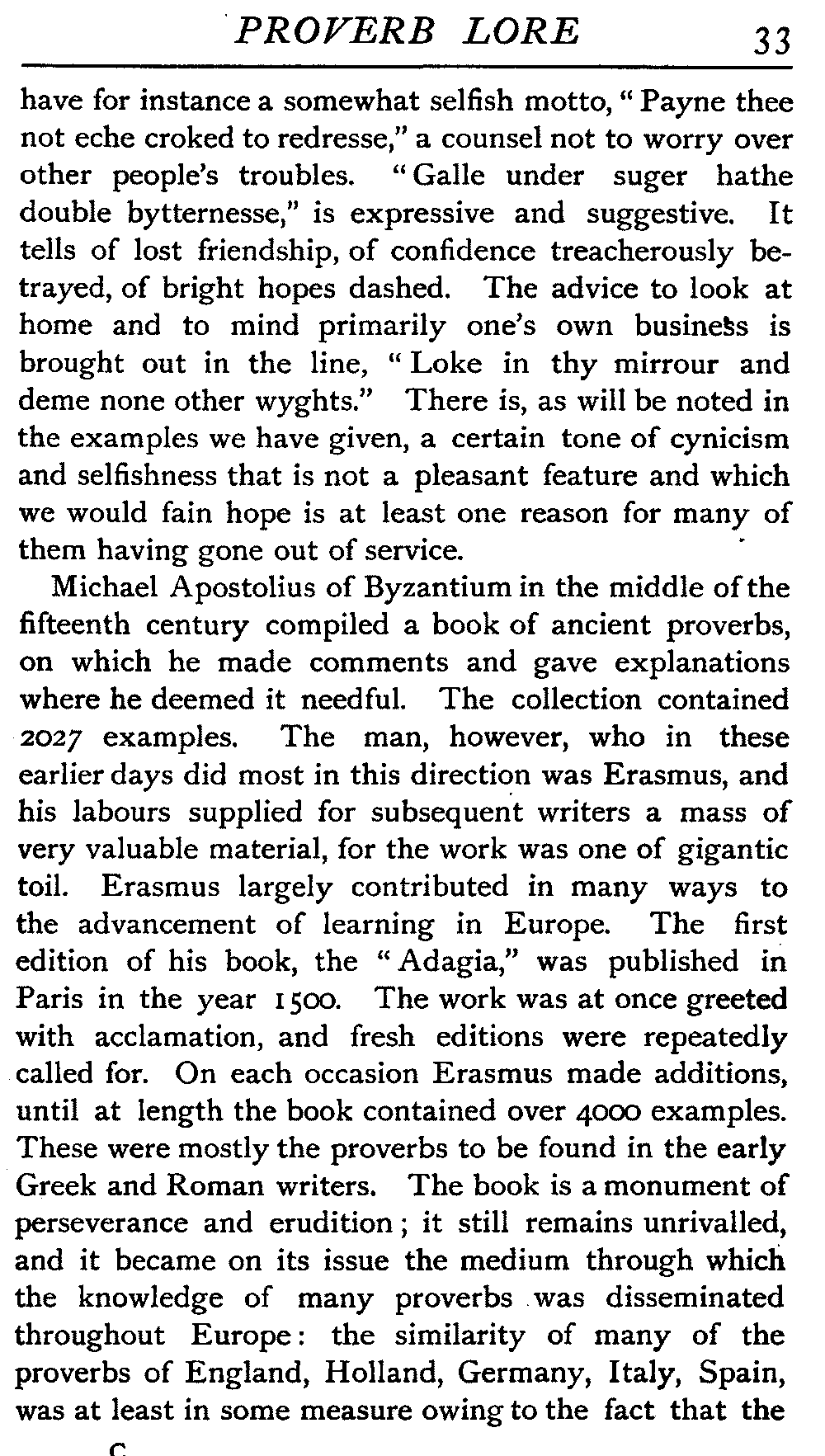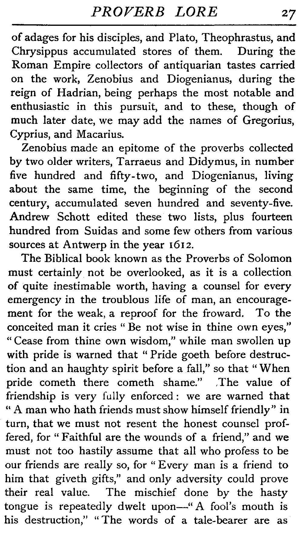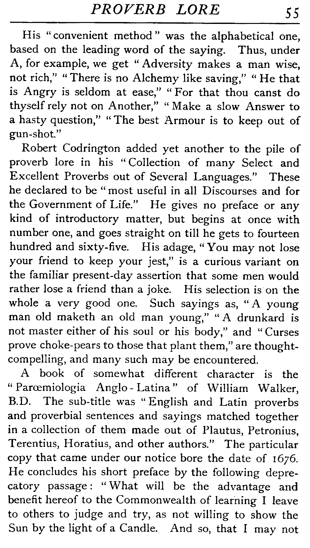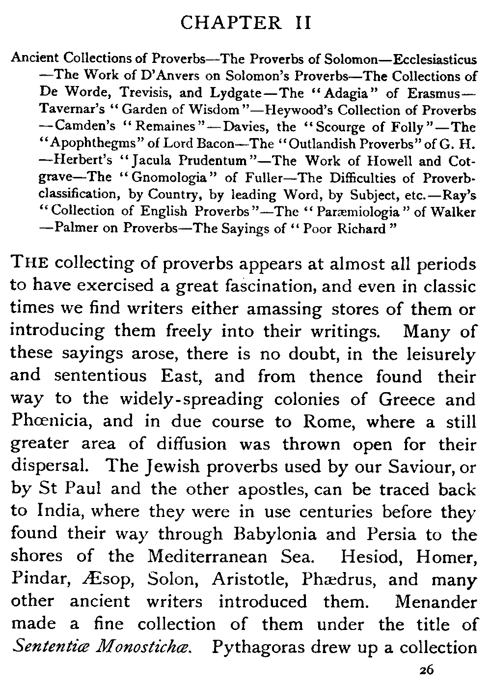 | Ancient Collections of Proverbs—The Proverbs of Solomon—Ecclesiasticus—The Work of D'Anvers on Solomon's Proverbs—The Collections of De Worde, Trevisis, and Lydgate—The "Adagia" of Erasmus—Tavernar's "Garden of Wisdom"—Heywood's Collection of Proverbs—Camden's "Remaines"—Davies, the "Scourge of Folly"—The "Apophthegms" of Lord Bacon—The "Outlandish Proverbs" of G. H.—Herbert's "Jacula Prudentum"—The Work of Howell and Cotgrave—The "Gnomologia" of Fuller—The Difficulties of Proverb-classification, by Country, by Leading Word, by Subject, etc.—Ray's "Collection of English Proverbs"—The "Paræmiologia" of Walker—Palmer on Proverbs—The Sayings of "Poor Richard" | 26 |