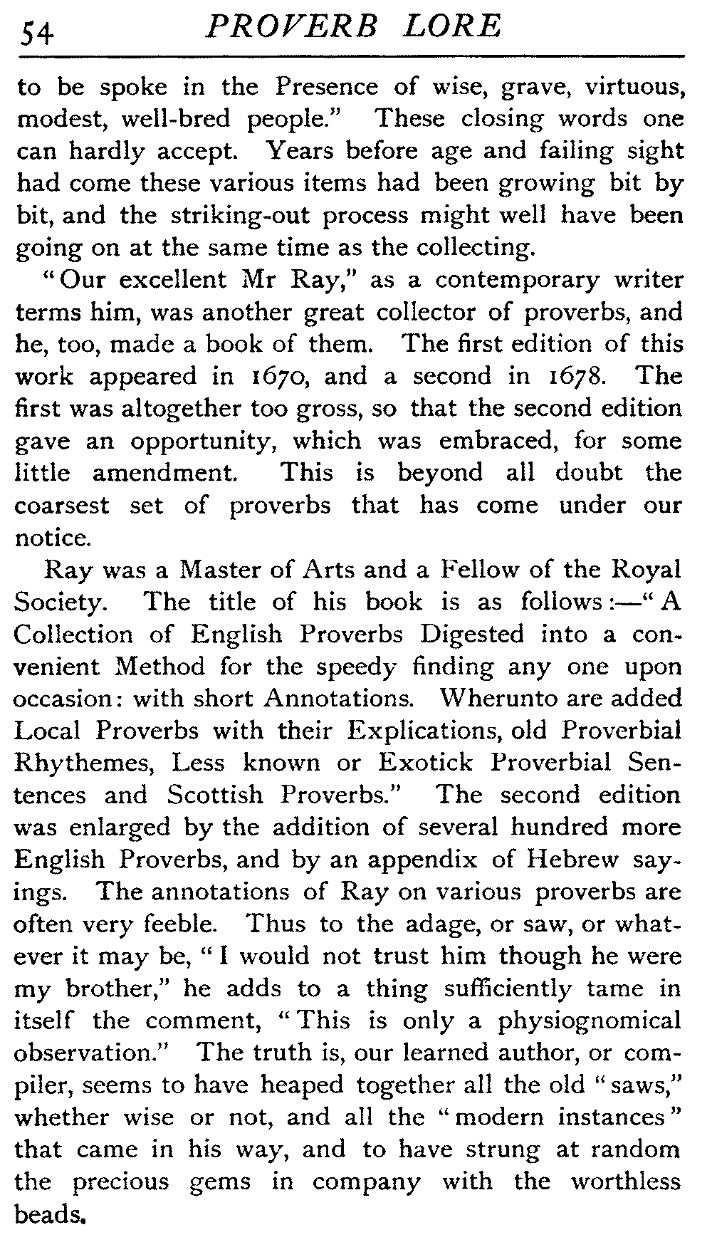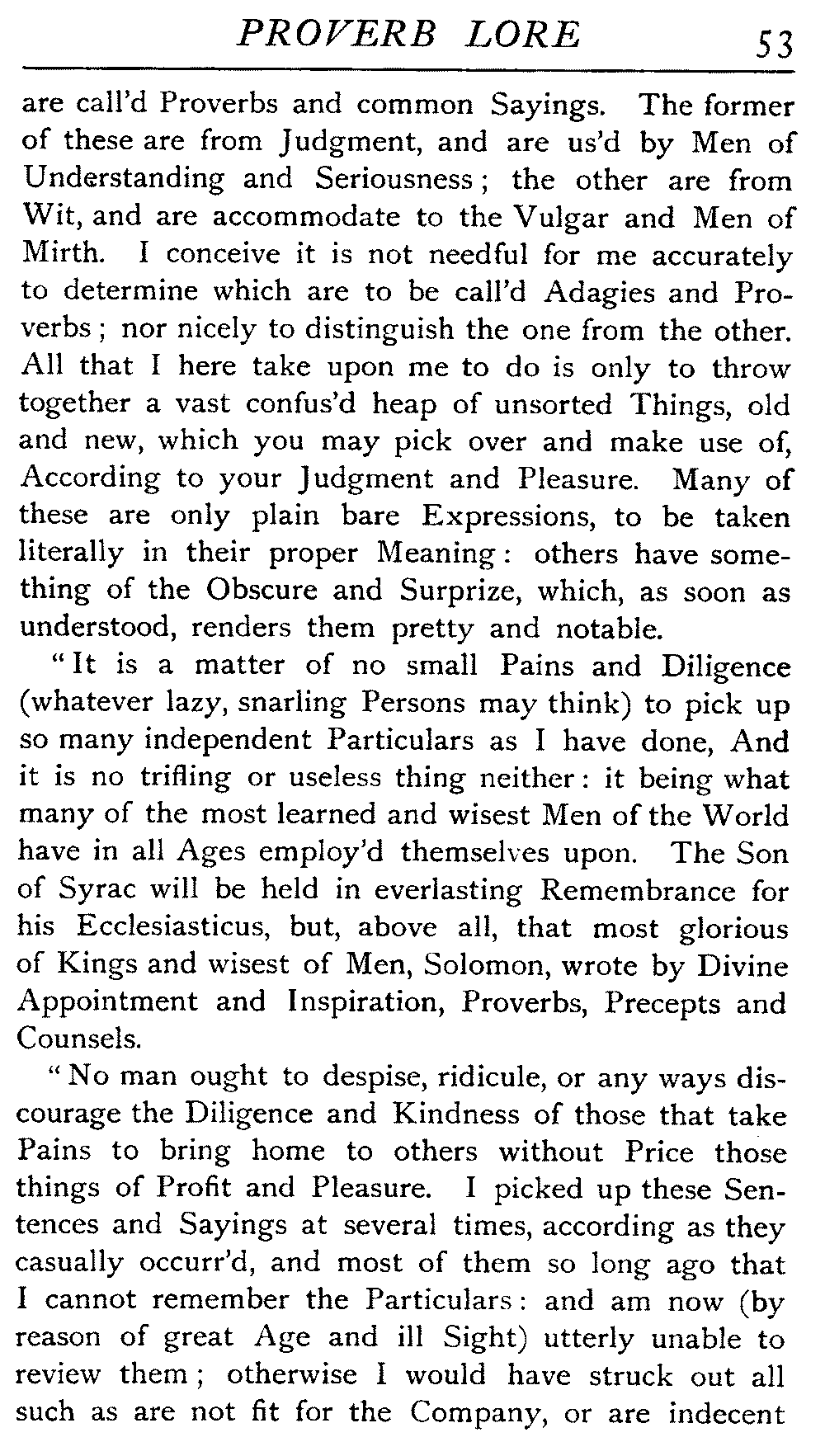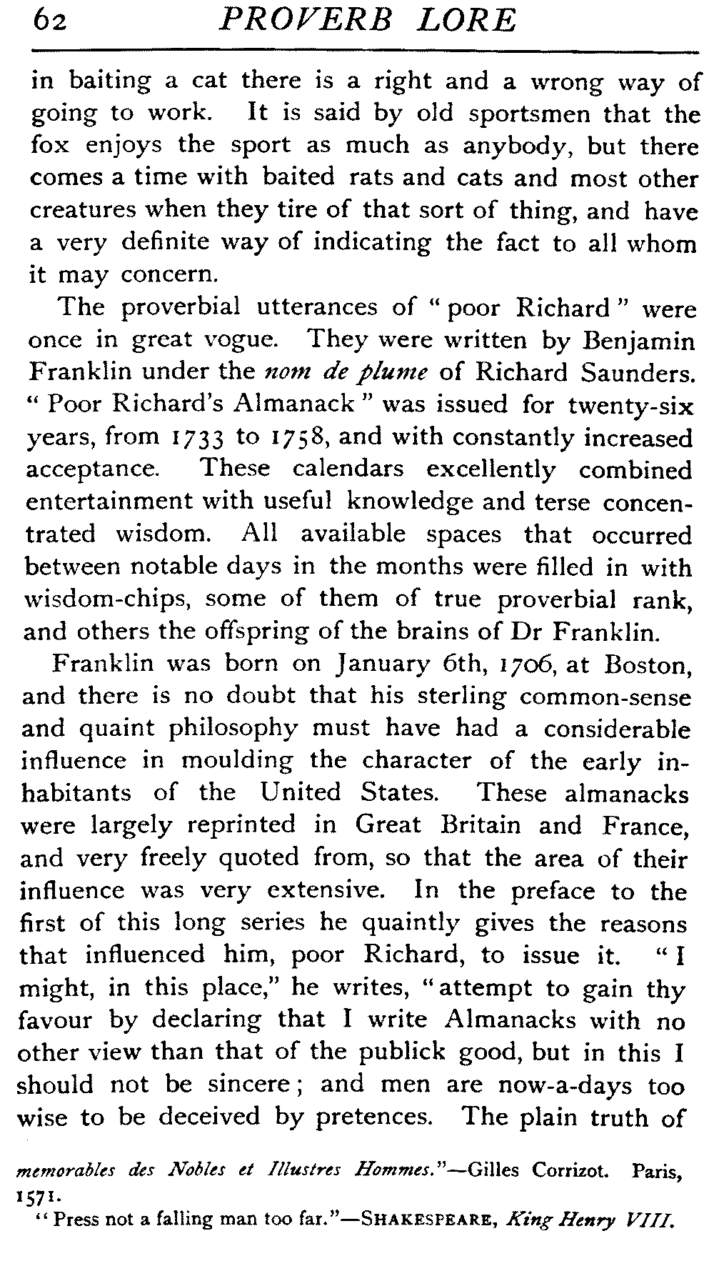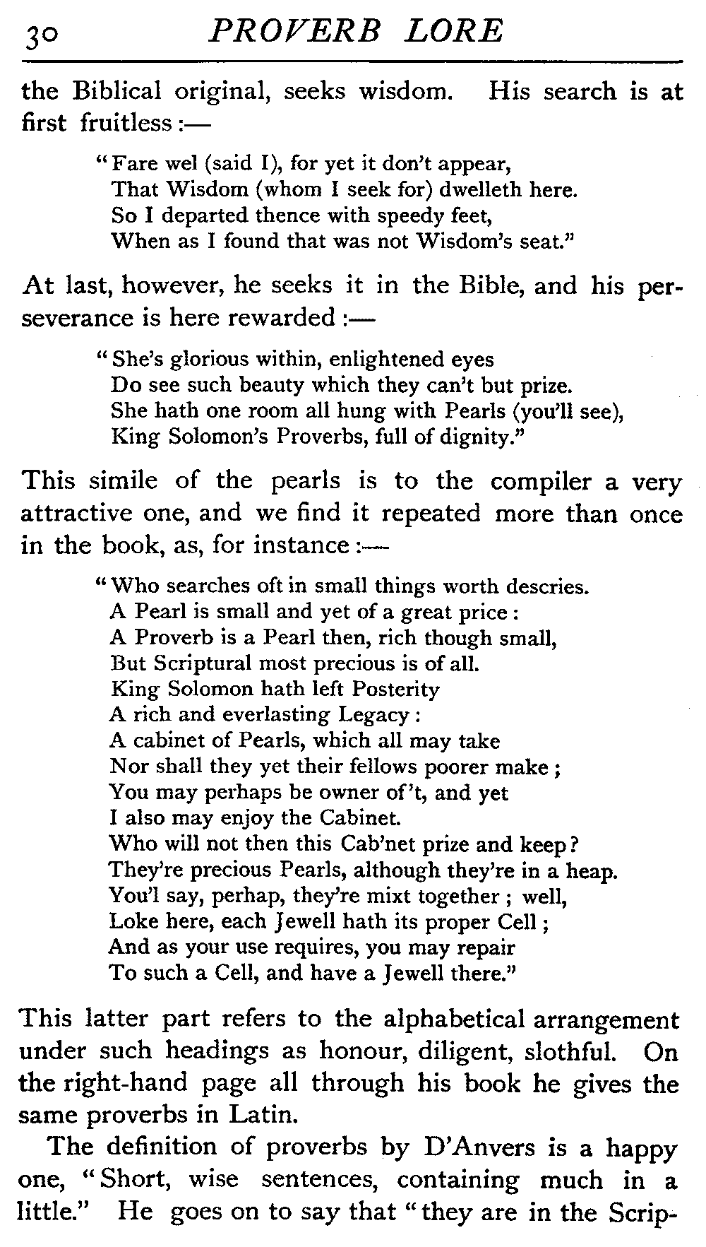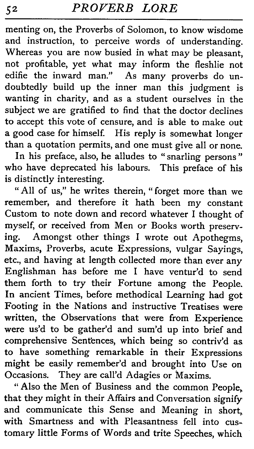 | Ancient Collections of Proverbs—The Proverbs of Solomon—Ecclesiasticus—The Work of D'Anvers on Solomon's Proverbs—The Collections of De Worde, Trevisis, and Lydgate—The "Adagia" of Erasmus—Tavernar's "Garden of Wisdom"—Heywood's Collection of Proverbs—Camden's "Remaines"—Davies, the "Scourge of Folly"—The "Apophthegms" of Lord Bacon—The "Outlandish Proverbs" of G. H.—Herbert's "Jacula Prudentum"—The Work of Howell and Cotgrave—The "Gnomologia" of Fuller—The Difficulties of Proverb-classification, by Country, by Leading Word, by Subject, etc.—Ray's "Collection of English Proverbs"—The "Paræmiologia" of Walker—Palmer on Proverbs—The Sayings of "Poor Richard" | 26 |