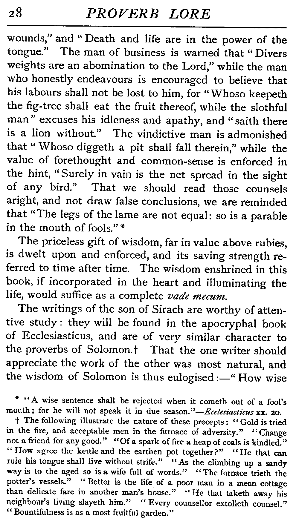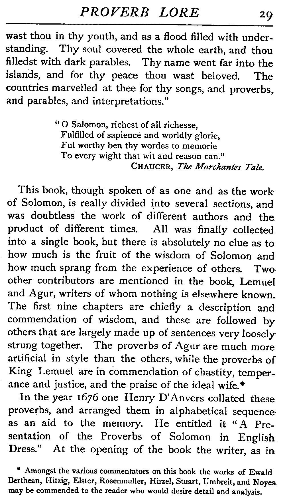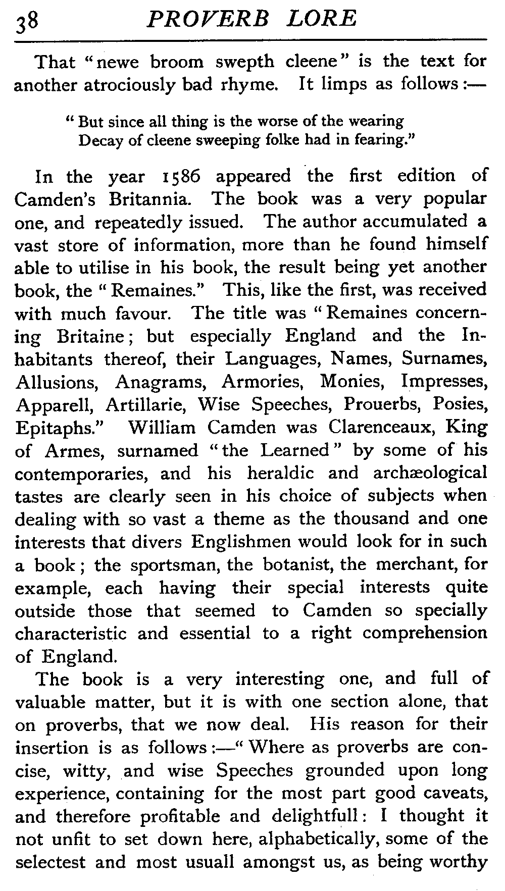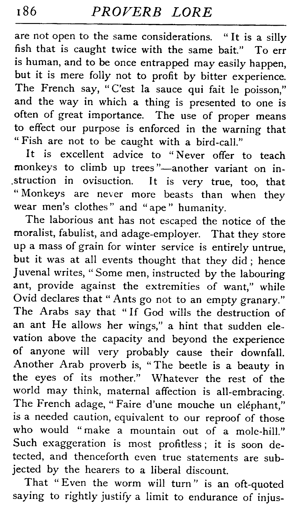 | Ancient Collections of Proverbs—The Proverbs of Solomon—Ecclesiasticus—The Work of D'Anvers on Solomon's Proverbs—The Collections of De Worde, Trevisis, and Lydgate—The "Adagia" of Erasmus—Tavernar's "Garden of Wisdom"—Heywood's Collection of Proverbs—Camden's "Remaines"—Davies, the "Scourge of Folly"—The "Apophthegms" of Lord Bacon—The "Outlandish Proverbs" of G. H.—Herbert's "Jacula Prudentum"—The Work of Howell and Cotgrave—The "Gnomologia" of Fuller—The Difficulties of Proverb-classification, by Country, by Leading Word, by Subject, etc.—Ray's "Collection of English Proverbs"—The "Paræmiologia" of Walker—Palmer on Proverbs—The Sayings of "Poor Richard" | 26 |
