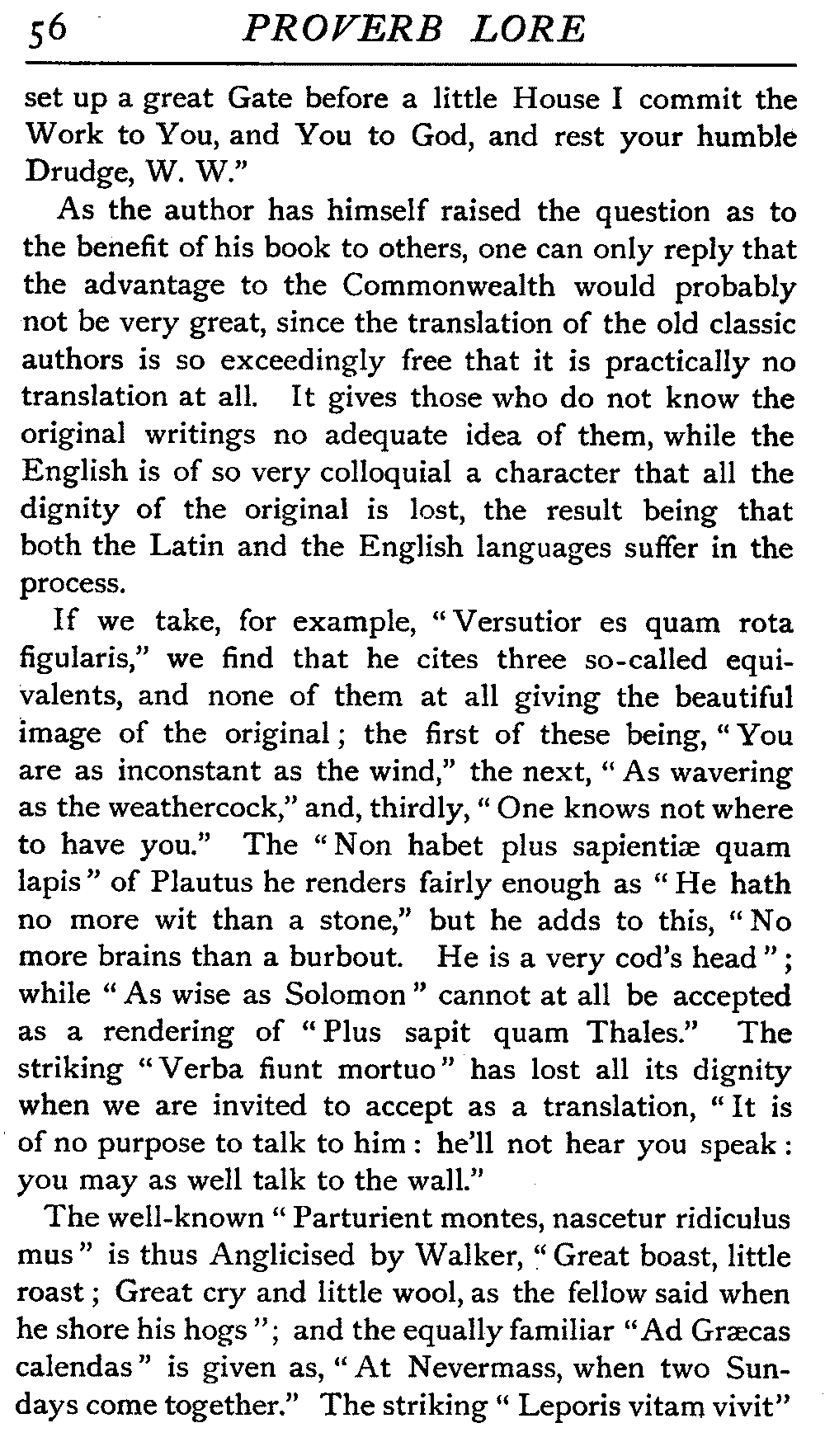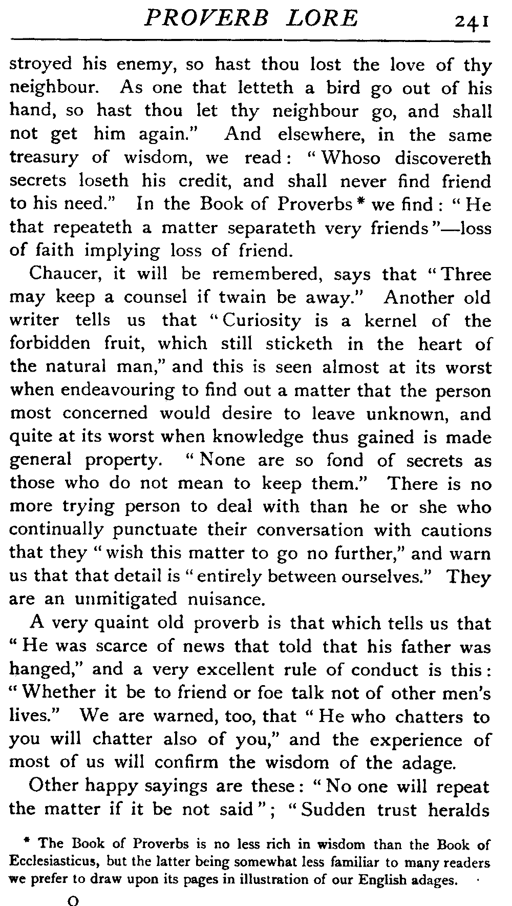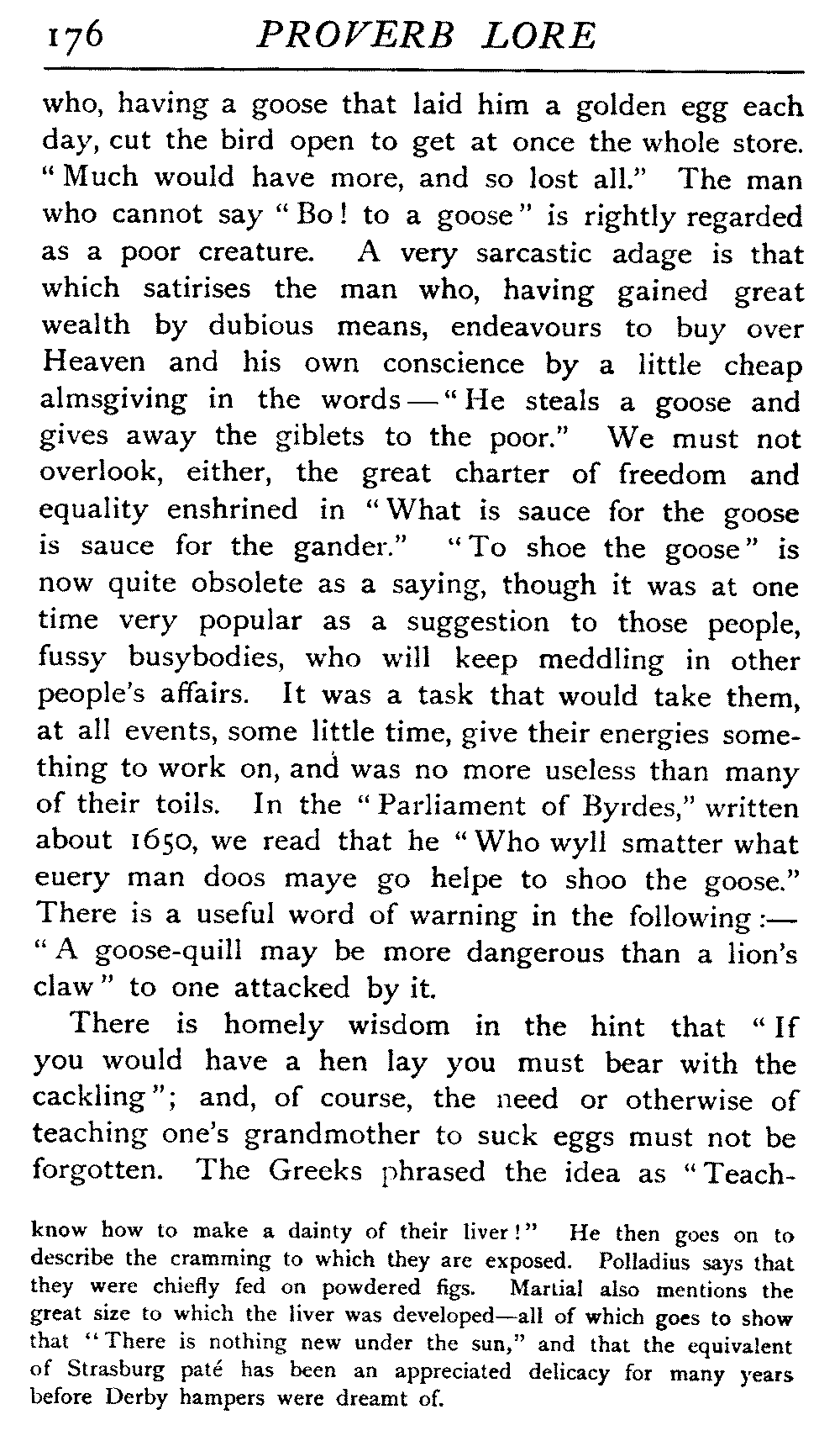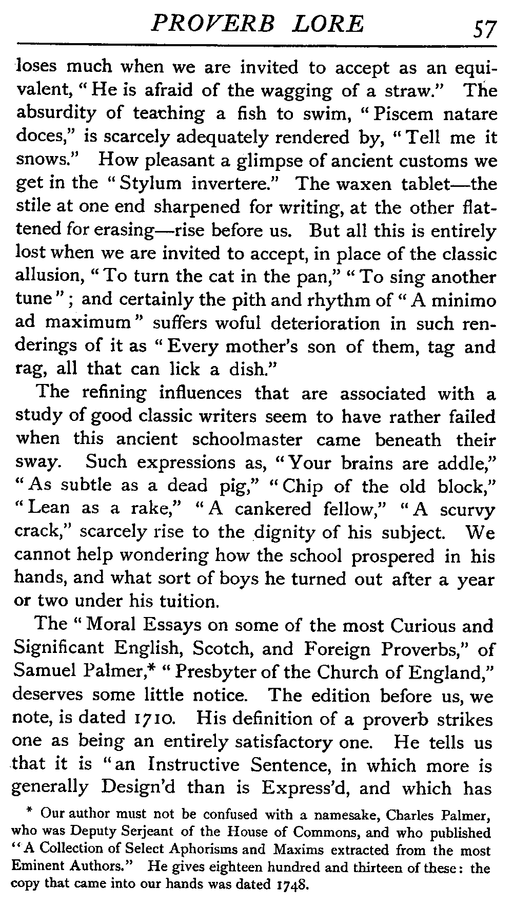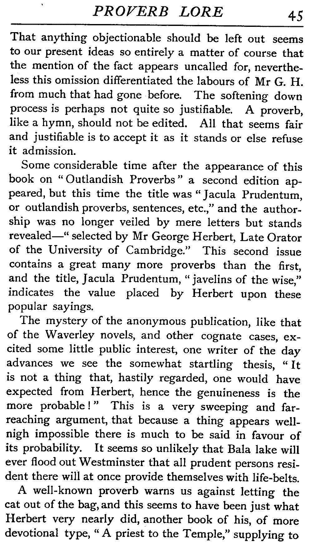 | Ancient Collections of Proverbs—The Proverbs of Solomon—Ecclesiasticus—The Work of D'Anvers on Solomon's Proverbs—The Collections of De Worde, Trevisis, and Lydgate—The "Adagia" of Erasmus—Tavernar's "Garden of Wisdom"—Heywood's Collection of Proverbs—Camden's "Remaines"—Davies, the "Scourge of Folly"—The "Apophthegms" of Lord Bacon—The "Outlandish Proverbs" of G. H.—Herbert's "Jacula Prudentum"—The Work of Howell and Cotgrave—The "Gnomologia" of Fuller—The Difficulties of Proverb-classification, by Country, by Leading Word, by Subject, etc.—Ray's "Collection of English Proverbs"—The "Paræmiologia" of Walker—Palmer on Proverbs—The Sayings of "Poor Richard" | 26 |